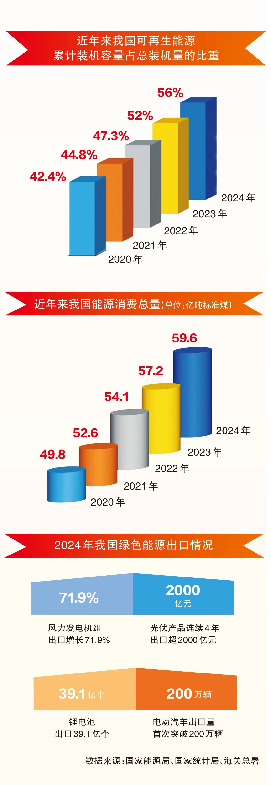 2024年,我國(guó)風(fēng)力發(fā)電機(jī)組出口增長(zhǎng)71.9%;光伏產(chǎn)品連續(xù)4年出口超2000億元;鋰電池出口39.1億個(gè);電動(dòng)汽車(chē)出口量首次突破200萬(wàn)輛,創(chuàng)歷史新高。我國(guó)的綠色貿(mào)易領(lǐng)跑全球。能源成為我國(guó)外貿(mào)的重要領(lǐng)域之一,拉動(dòng)總量、增量、質(zhì)量“三量”齊升。