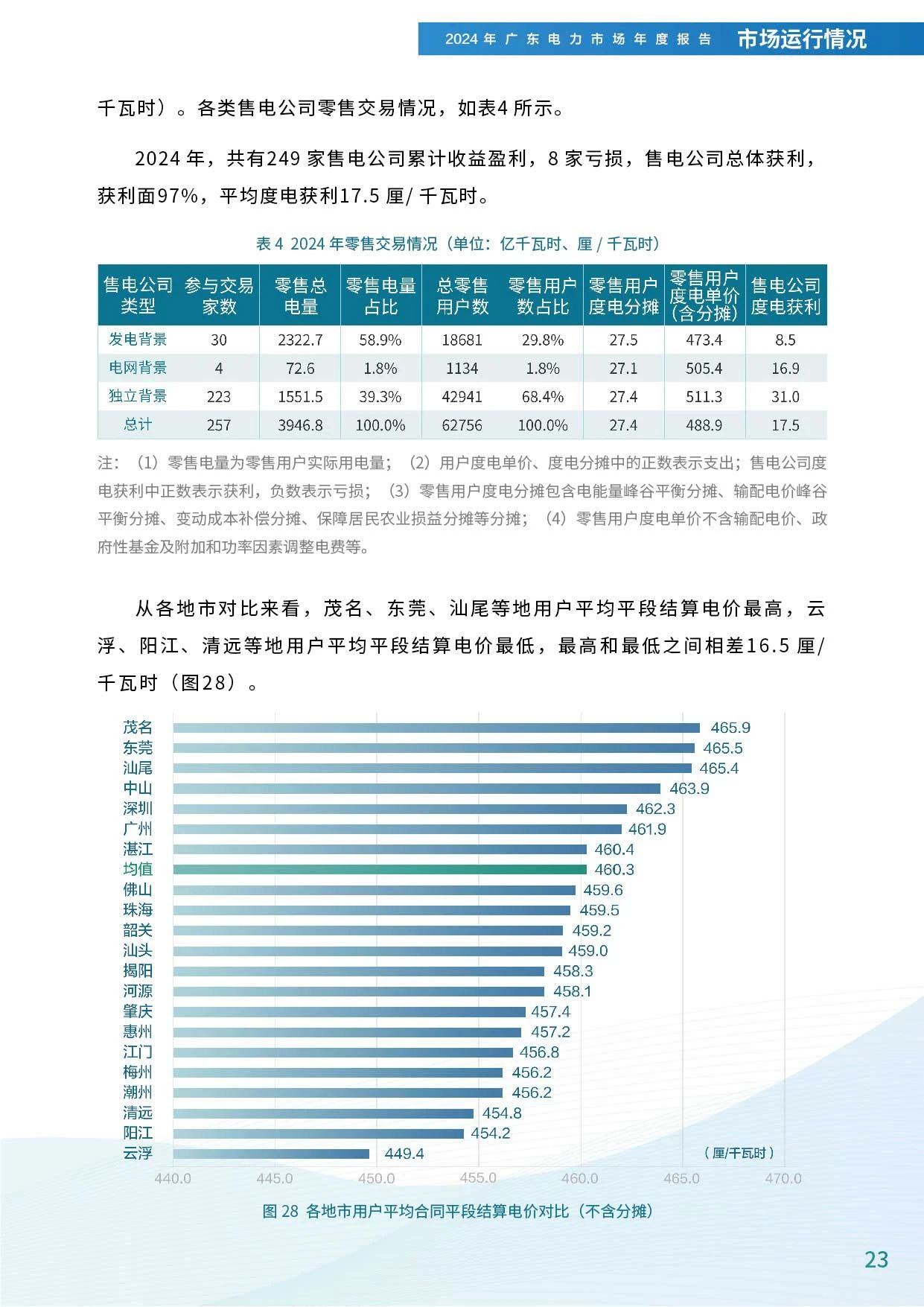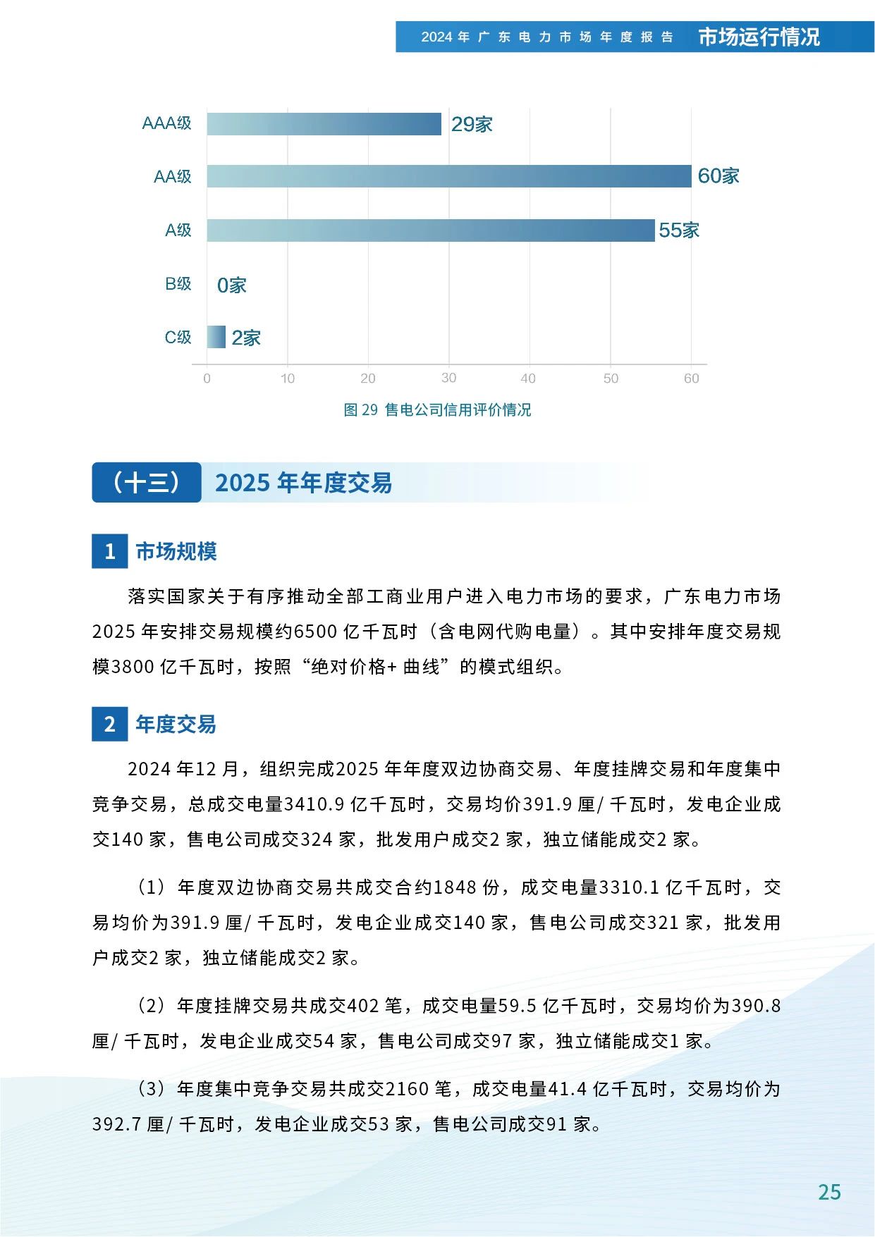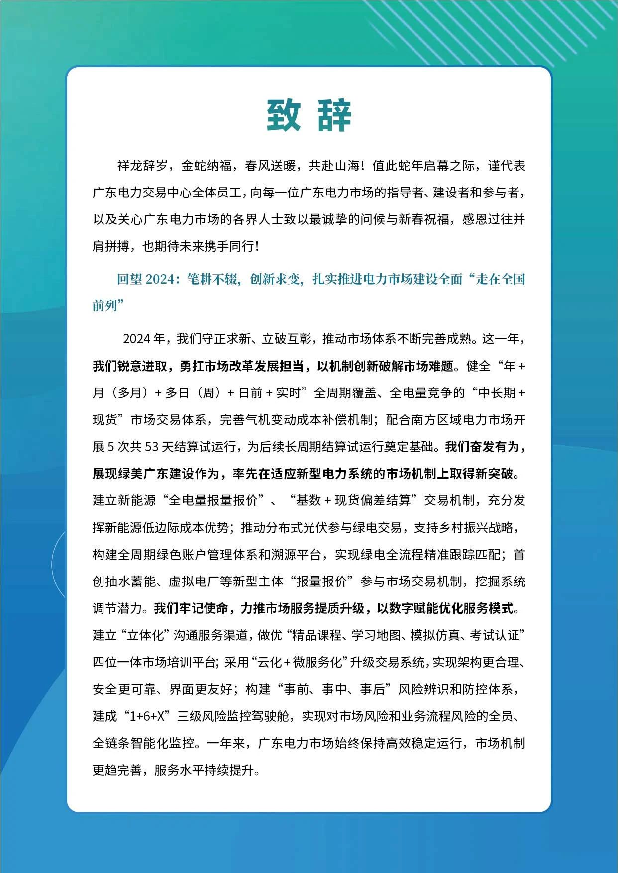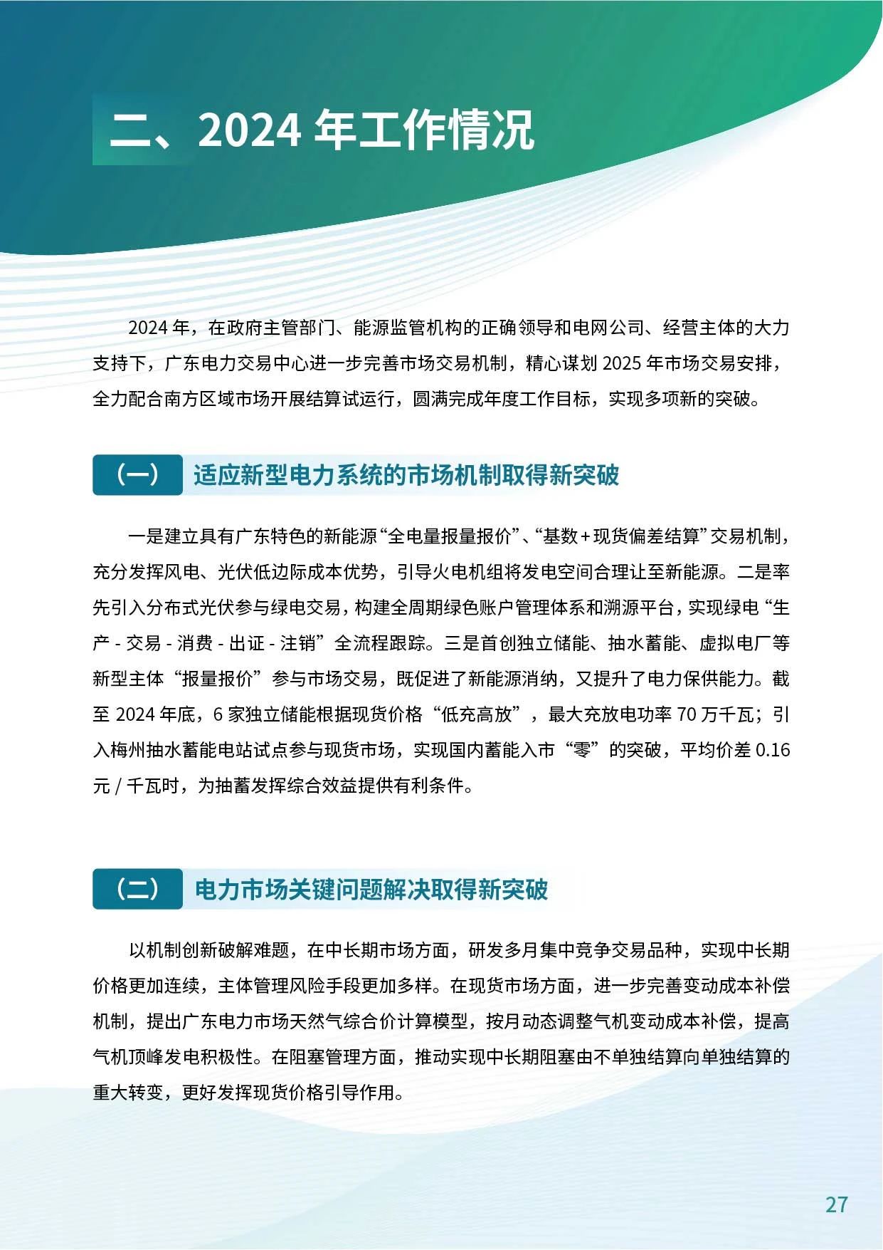 2024年,是廣東現(xiàn)貨市場正式運(yùn)行的第一年,全年交易規(guī)模達(dá)6176.2億千瓦時(全國第一)。其中市場直接交易電量3948.2億千瓦時,同比增長25%;交易主體多元豐富,涵蓋火電、核電、風(fēng)電、光伏、新型儲能、抽水蓄能等,全省市場主體近10萬家;現(xiàn)貨市場日前價格在0.068-0.525元/kWh之間波動綠電交易電量72.6億千瓦時,分布式光伏參與綠電交易突破1億千瓦時,充分滿足企業(yè)綠電消費需求;引入抽水蓄能試點參與交易,建立虛擬電廠市場交易機(jī)制,充分挖掘系統(tǒng)靈活調(diào)節(jié)能力。一年來,廣東電力市場持續(xù)平穩(wěn)有序運(yùn)行。