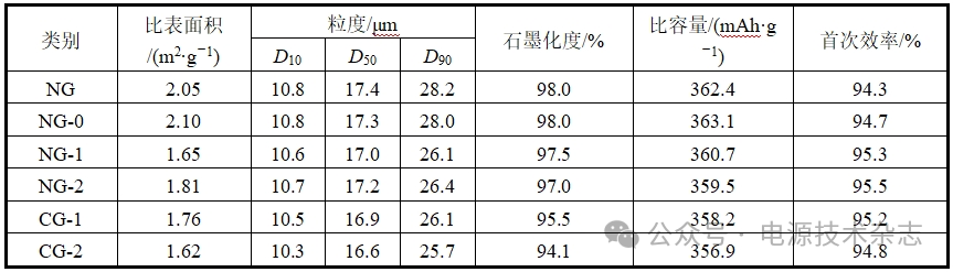 采用激光粒度分析儀(Mastersizer 3000)、氮?dú)馕摳絻x(康塔NOVA touch LX4)、X射線衍射儀(D/MAX 2500V/PC)和掃描電子顯微鏡(JSM-6360LV)對(duì)石墨材料粒度、比表面積、石墨化度和微觀形貌進(jìn)行表征分析。