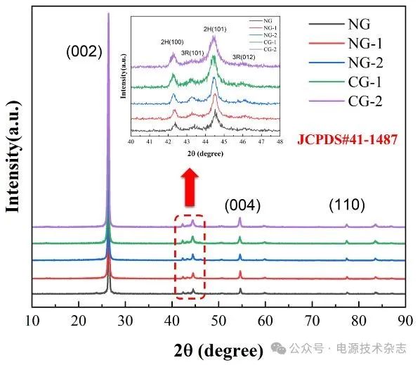 圖3為不同種類(lèi)石墨材料的X射線衍射(XRD)圖,從中可以看到,幾種材料的(002)晶面衍射峰位置基本一致,表明材料層狀結(jié)構(gòu)基本一致[13]。將2θ角度在40°~48°的XRD衍射圖放大,可以發(fā)現(xiàn)NG、NG-1和NG-2三款天然石墨材料不僅具有六方結(jié)構(gòu)的2H相,還明顯可以看到有菱形結(jié)構(gòu)的3R相存在,表明天然石墨同時(shí)具有2H相和3R相,而人造石墨一般只有2H相,沒(méi)有3R相存在。因此,從圖3的放大圖中可以看到,復(fù)合部分人造石墨的復(fù)合石墨CG-1與CG-2的3R相對(duì)應(yīng)的峰強(qiáng)度隨人造石墨占比提高而降低。添加30%人造石墨的CG-1的XRD圖譜中還可以看到3R相的存在,但相比純天然石墨NG-2,3R相的峰強(qiáng)度有所降低;添加50%人造石墨的CG-2的XRD圖譜中則幾乎無(wú)法看到3R相的存在,表明當(dāng)材料中3R相的比例較低時(shí),在XRD譜圖中很難發(fā)現(xiàn)其存在。