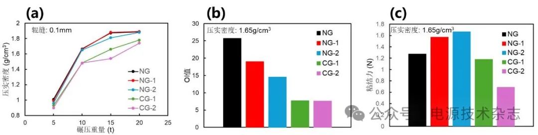 針對(duì)石墨負(fù)極材料,涉及到一個(gè)取向性的概念,一般用OI值來(lái)表示;OI值的計(jì)算方法為XRD譜圖中(004)峰與(110)峰的峰強(qiáng)度比值,OI值越小,材料的各向同性越好,越有利于膨脹控制及Li+的擴(kuò)散。圖4(b)為不同石墨極片的OI值柱狀圖,通過(guò)純天然石墨NG、NG-1和NG-2的對(duì)比,可以看到對(duì)天然石墨進(jìn)行致密化處理,可降低極片OI值,這是因?yàn)轭w粒內(nèi)部孔隙被填充后,材料在碾壓時(shí)更能保持原有的取向性,而不是趨于一致的取向,因此OI值有所降低;復(fù)合人造石墨后,因復(fù)合的人造石墨為二次顆粒產(chǎn)品,各向同性較好,因此復(fù)合材料OI值相比純天然石墨NG-2顯著降低。