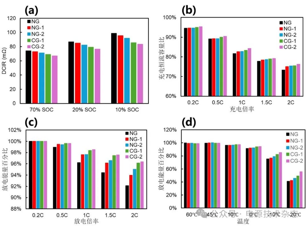 (a)DCIR柱狀圖;(b)倍率充電恒流容量比圖;(c)倍率放電能量圖;(d)不同溫度放電能量圖