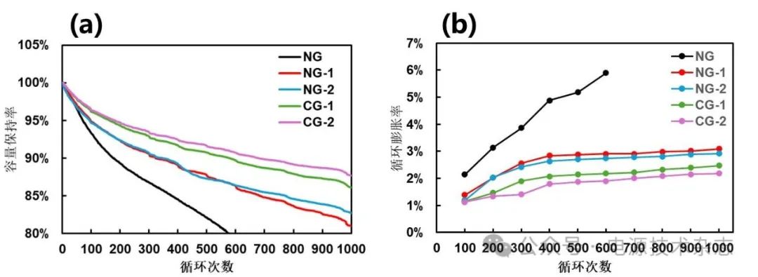 (a)循環(huán)容量保持率曲線 (b)循環(huán)膨脹率曲線