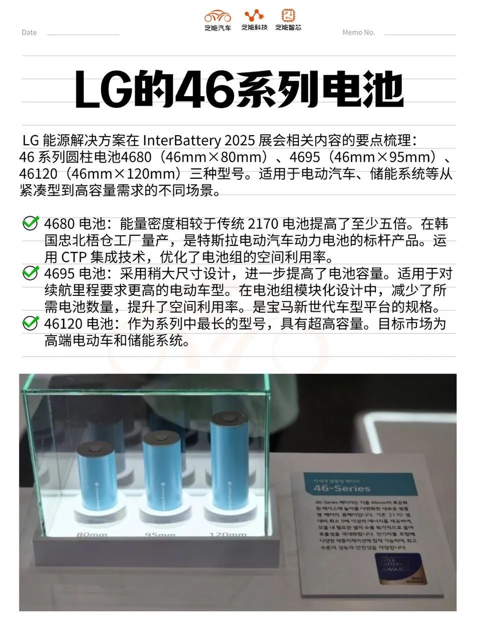 LG能源解決方案在InterBattery 2025展會上以其榮獲“InterBattery Awards”的46系列圓柱形電池為核心,展出的三款產品分別是4680(直徑46mm x 高度80mm)、4695(46mm x 95mm)和46120(46mm x 120mm),覆蓋了從緊湊型到高容量需求的多種應用場景。