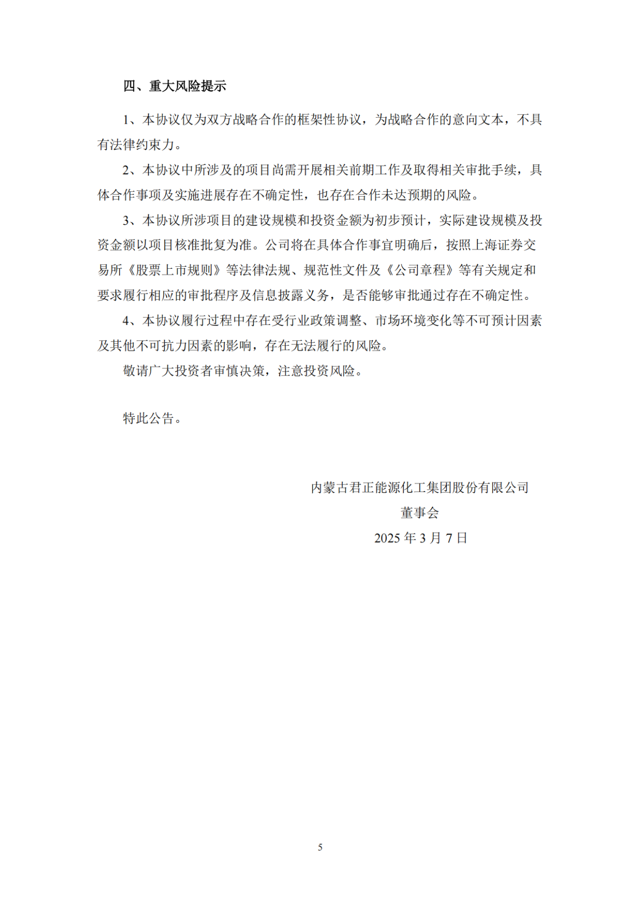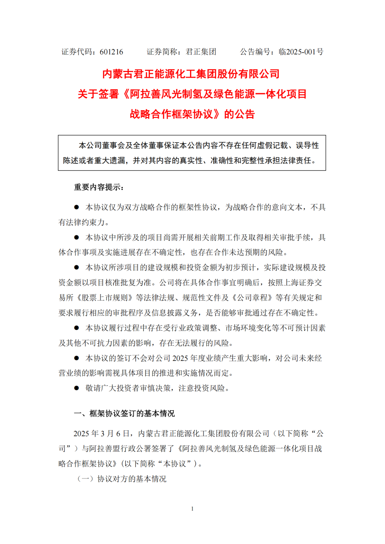中國儲能網(wǎng)訊:3月6日,內(nèi)蒙古君正能源化工集團股份有限公司(簡稱:君正集團)發(fā)布關于簽署《阿拉善風光制氫及綠色能源一體化項目戰(zhàn)略合作框架協(xié)議》的公告。