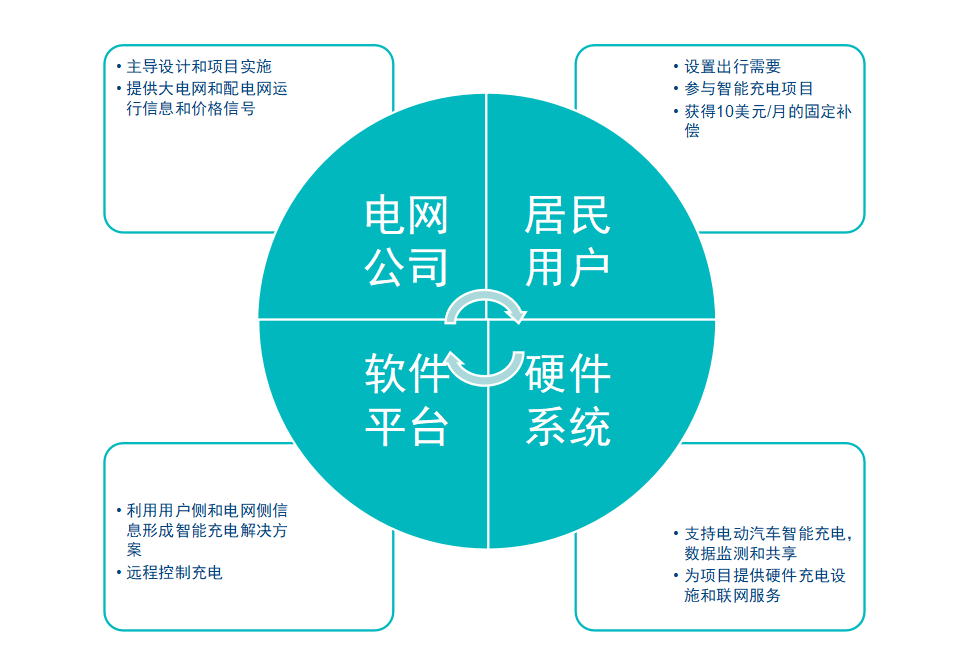 2020年,在美國能源部支持下,馬里蘭州公共服務(wù)委員會(huì)批準(zhǔn)了在Exelon 旗下的三家電力公司開展智能管理充電示范項(xiàng)目。此項(xiàng)目的主要目的是研究探索智能充電系統(tǒng),并根據(jù)大電網(wǎng)配電網(wǎng)的情況優(yōu)化充電,減少電動(dòng)汽車對(duì)電網(wǎng)的沖擊。對(duì)于擁有電動(dòng)汽車的居民用戶而言,他們可以通過第三方平臺(tái)Weave Grid參與項(xiàng)目,授予其通過電動(dòng)汽車充電裝置和車載信息遠(yuǎn)程收集數(shù)據(jù)和控制充電的權(quán)利,并獲得一定的回報(bào)[8]。智能充電項(xiàng)目涉及了多個(gè)相關(guān)方,除了主要的參與方以外(見下圖),還囊括了非政府組織和聯(lián)邦研究機(jī)構(gòu)的協(xié)助,以確保軟硬件系統(tǒng)的安全可靠,并對(duì)項(xiàng)目進(jìn)行分析評(píng)估和市場(chǎng)推廣。