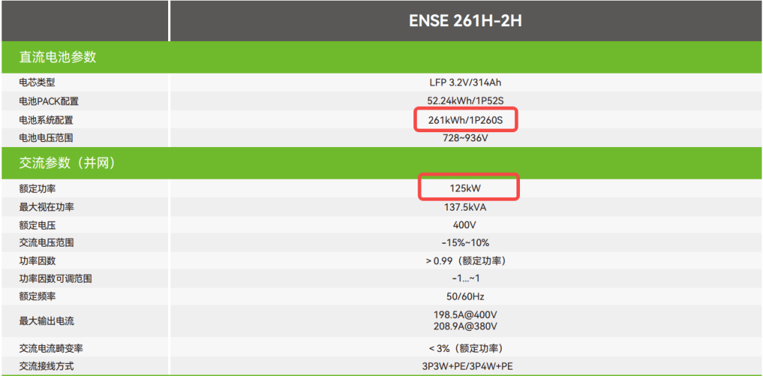 儲(chǔ)能項(xiàng)目常以“XX MW/XX MWh”形式標(biāo)注,如100MW/200MWh或125kW/261kWh(常見的儲(chǔ)能一體柜參數(shù))。這里的比值(200MWh÷100MW=2小時(shí))稱為“儲(chǔ)能時(shí)長”,反映系統(tǒng)持續(xù)供電的時(shí)間。短時(shí)儲(chǔ)能(如1小時(shí))適用于調(diào)頻,長時(shí)儲(chǔ)能(如4小時(shí))則用于削峰填谷。