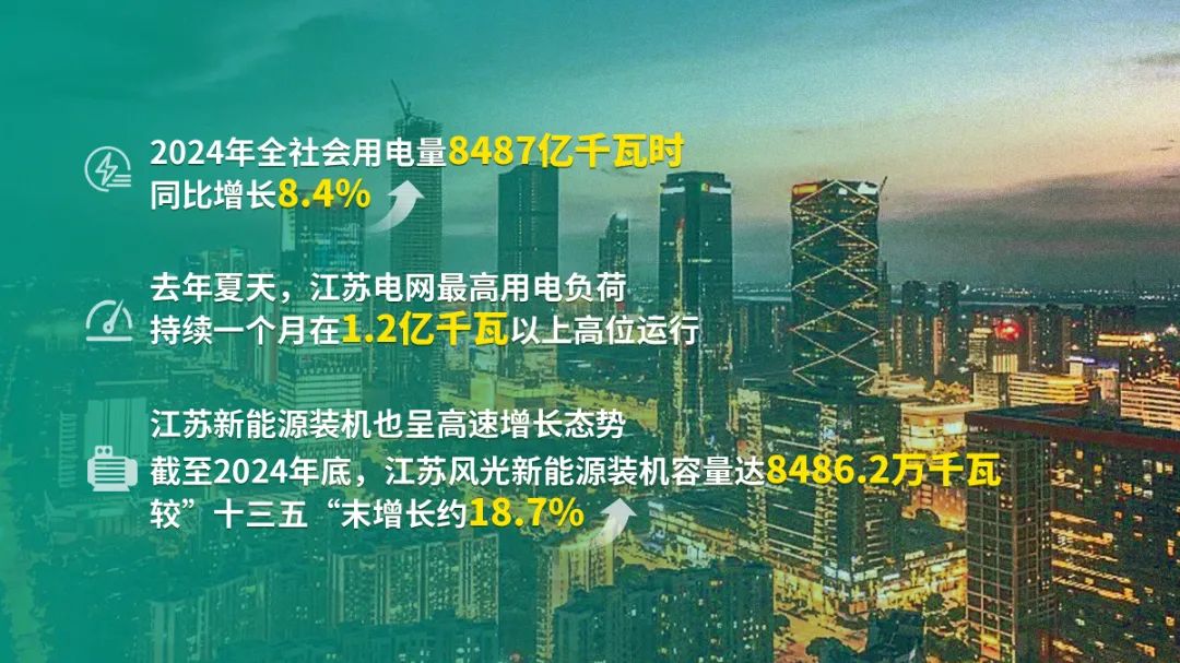 江蘇是我國經(jīng)濟最發(fā)達的省份之一,2024年全社會用電量達8487億千瓦時,同比增長8.4%。去年夏天,江蘇電網(wǎng)最高用電負荷持續(xù)一個月在1.2億千瓦以上高位運行。