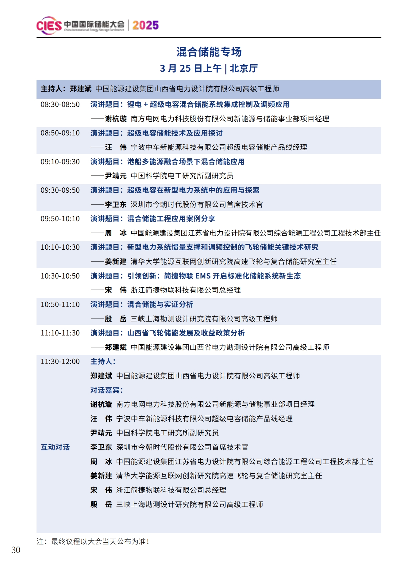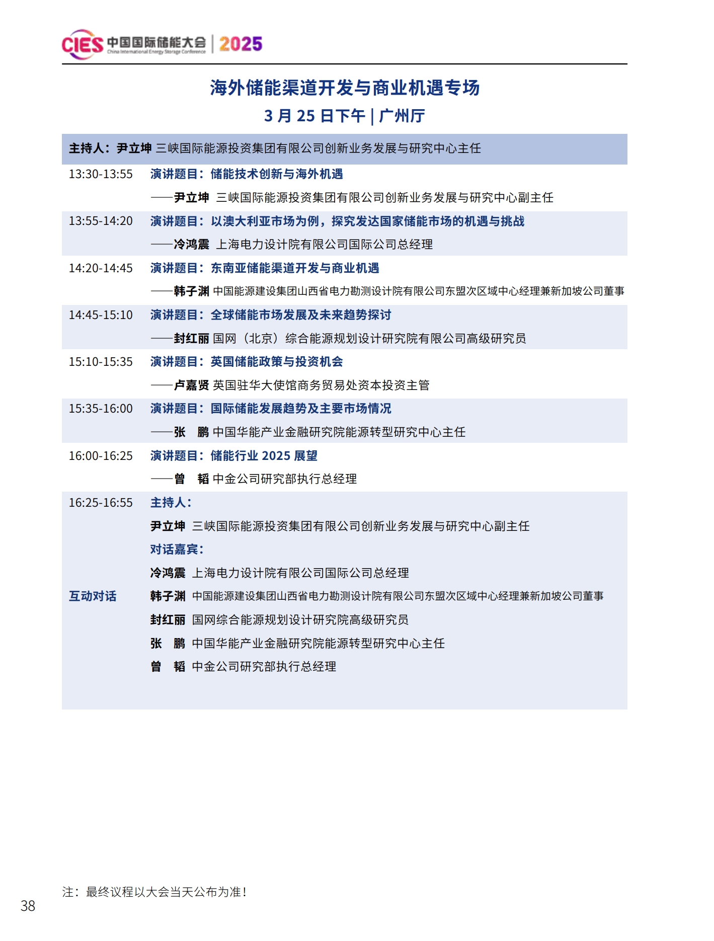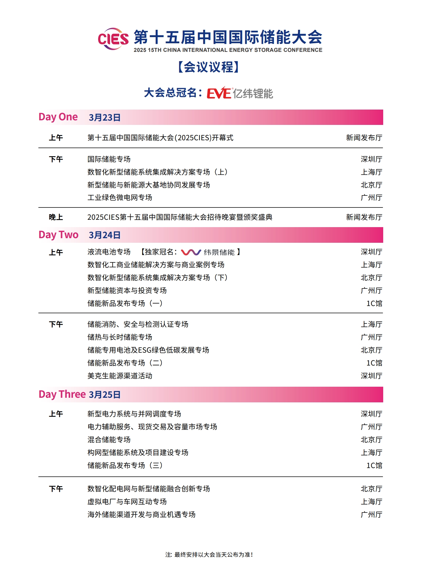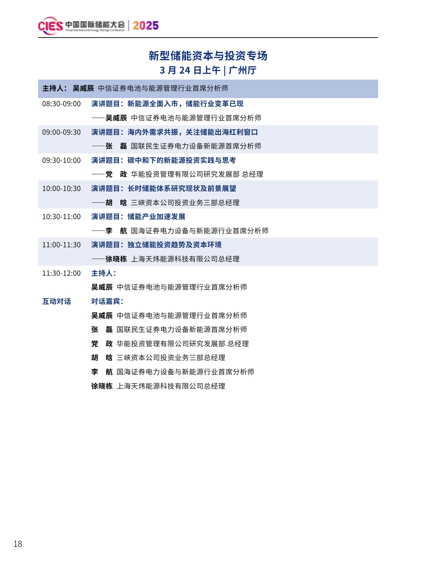 CIES2025儲能大會將設置:大會開幕式暨特邀院士專家報告、數(shù)智化配電網(wǎng)與新型儲能融合創(chuàng)新、新型電力系統(tǒng)與并網(wǎng)調(diào)度、新型儲能與新能源大基地協(xié)同發(fā)展、國際儲能、電力輔助服務、現(xiàn)貨交易及容量市場、工業(yè)綠色微電網(wǎng)、數(shù)智化新型儲能系統(tǒng)集成解決方案(上、下)、儲能消防、安全與檢測認證、新型儲能資本與投資、液流電池、儲熱與長時儲能技術、混合儲能、全球化新型儲能供應鏈機遇與挑戰(zhàn)、數(shù)智化工商業(yè)儲能解決方案與商業(yè)案例、虛擬電廠與車網(wǎng)互動、構網(wǎng)型儲能系統(tǒng)及項目建設、儲能專用電池ESG、新產(chǎn)品發(fā)布等22個專場。