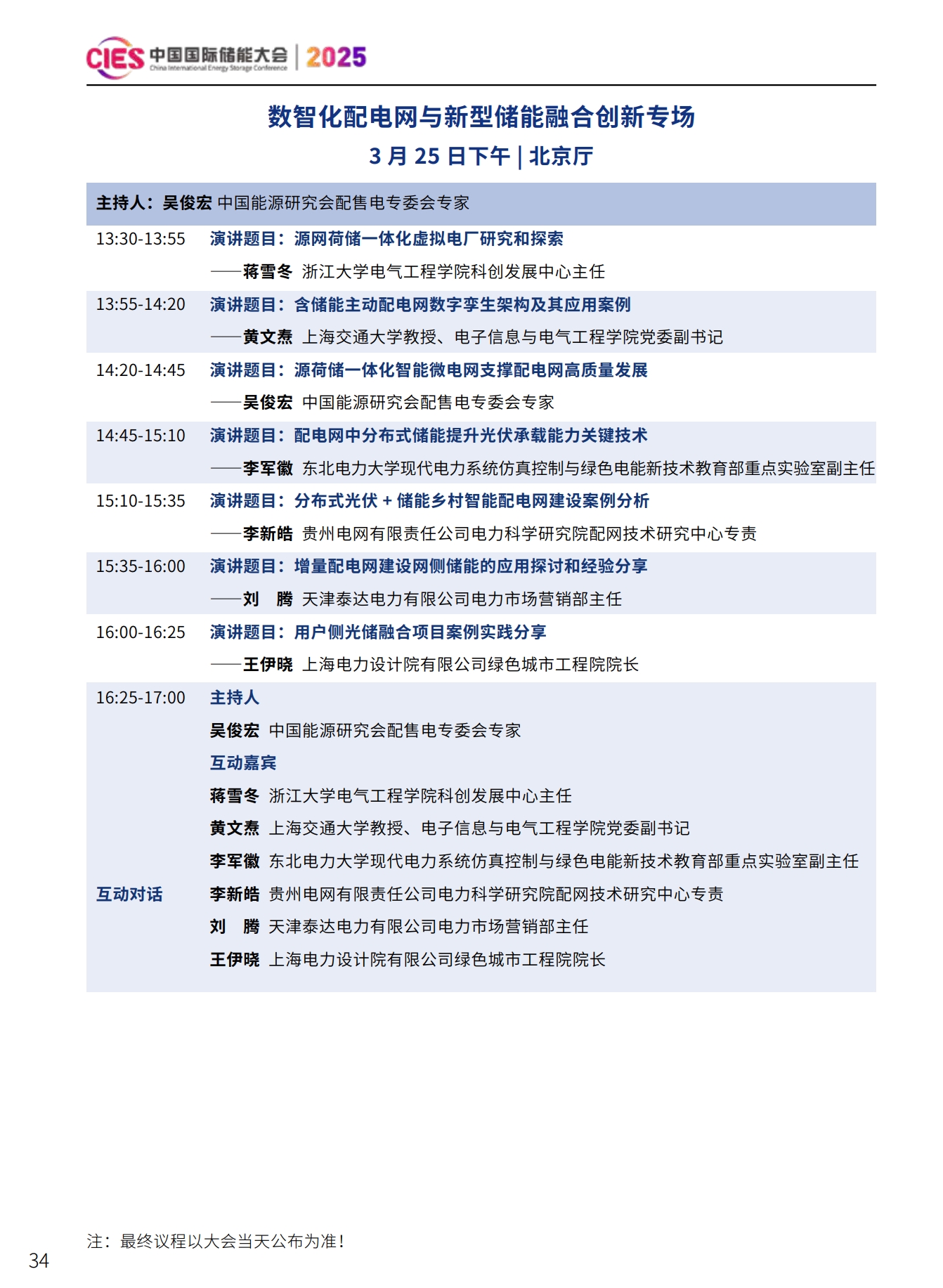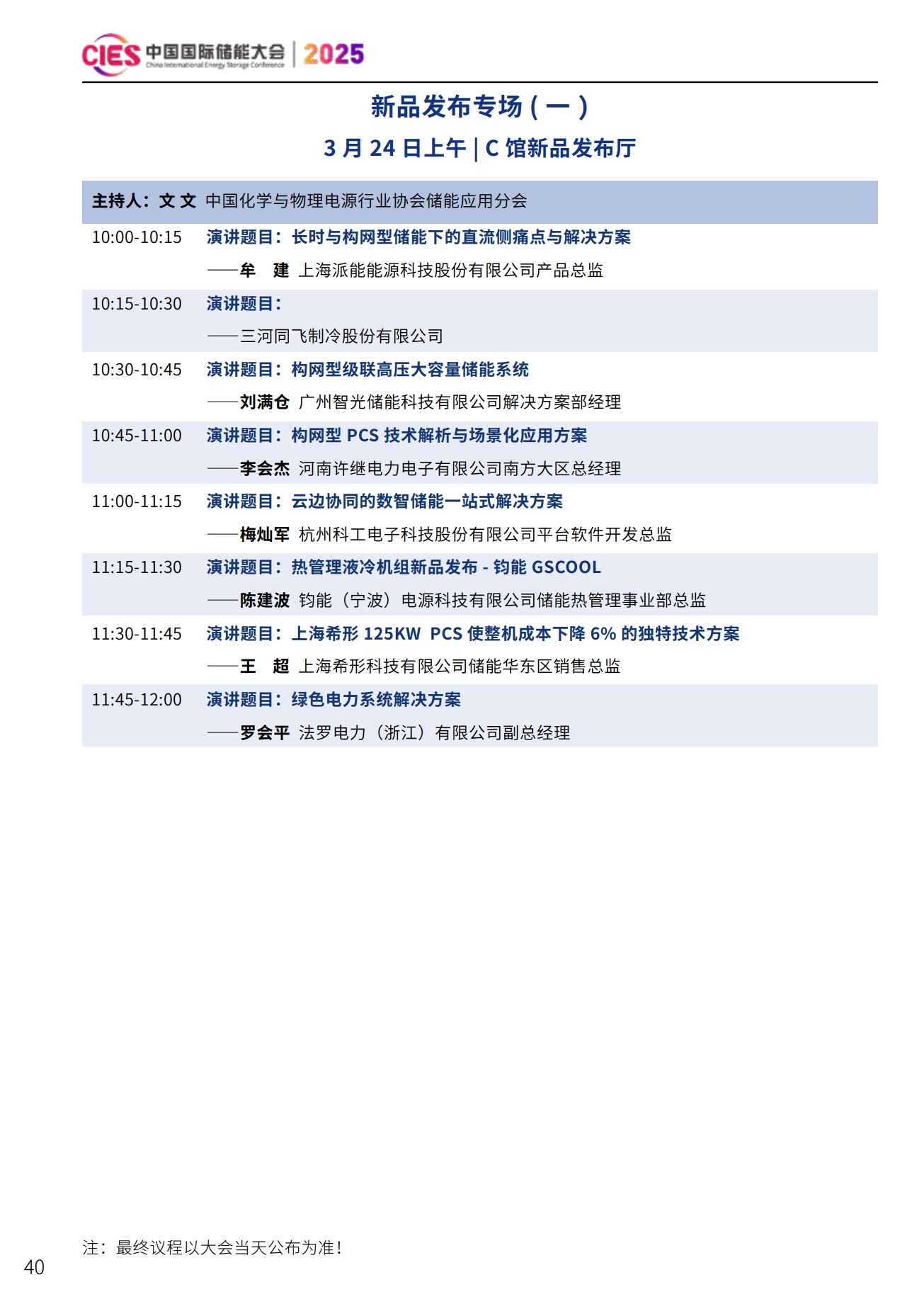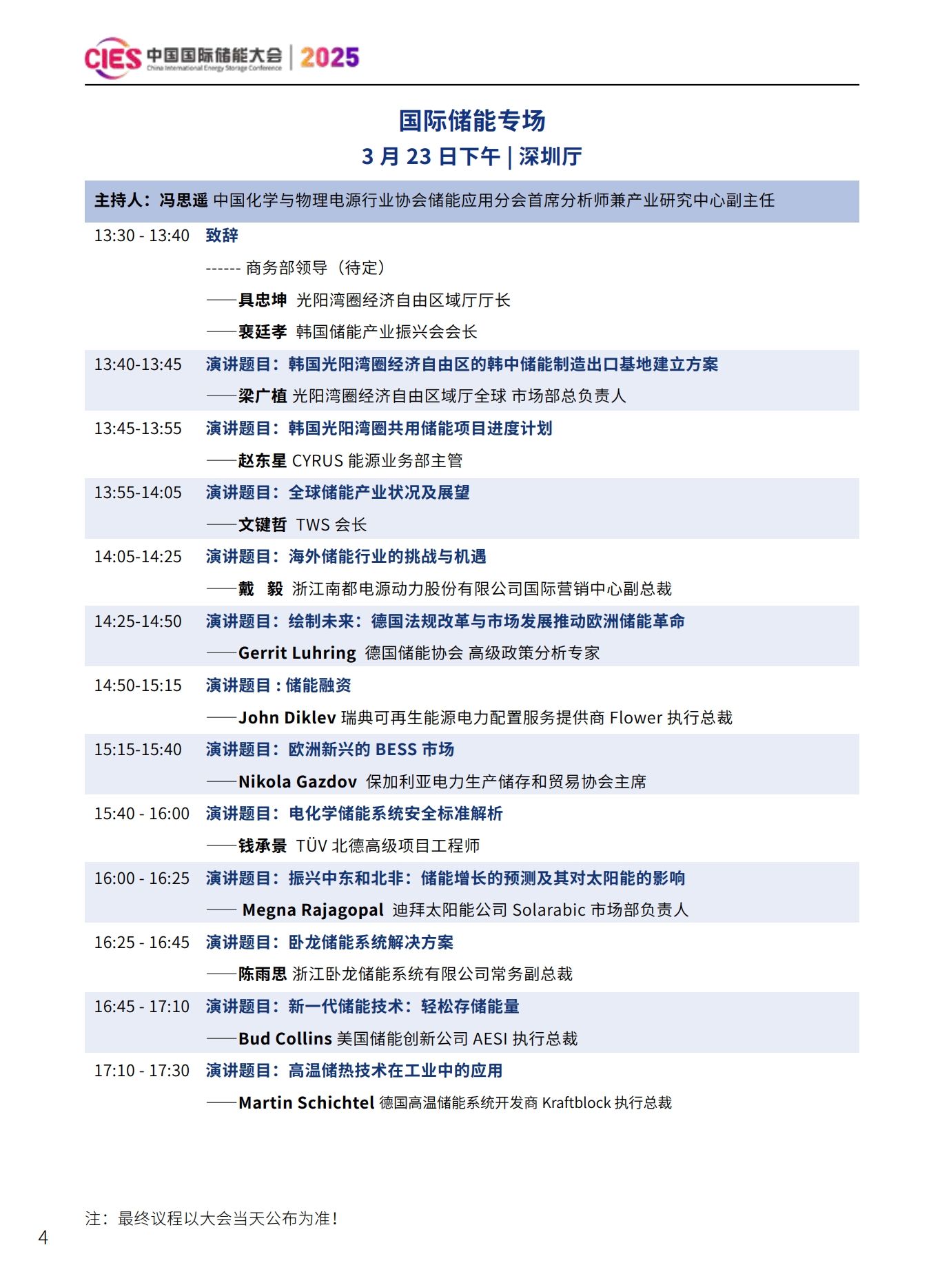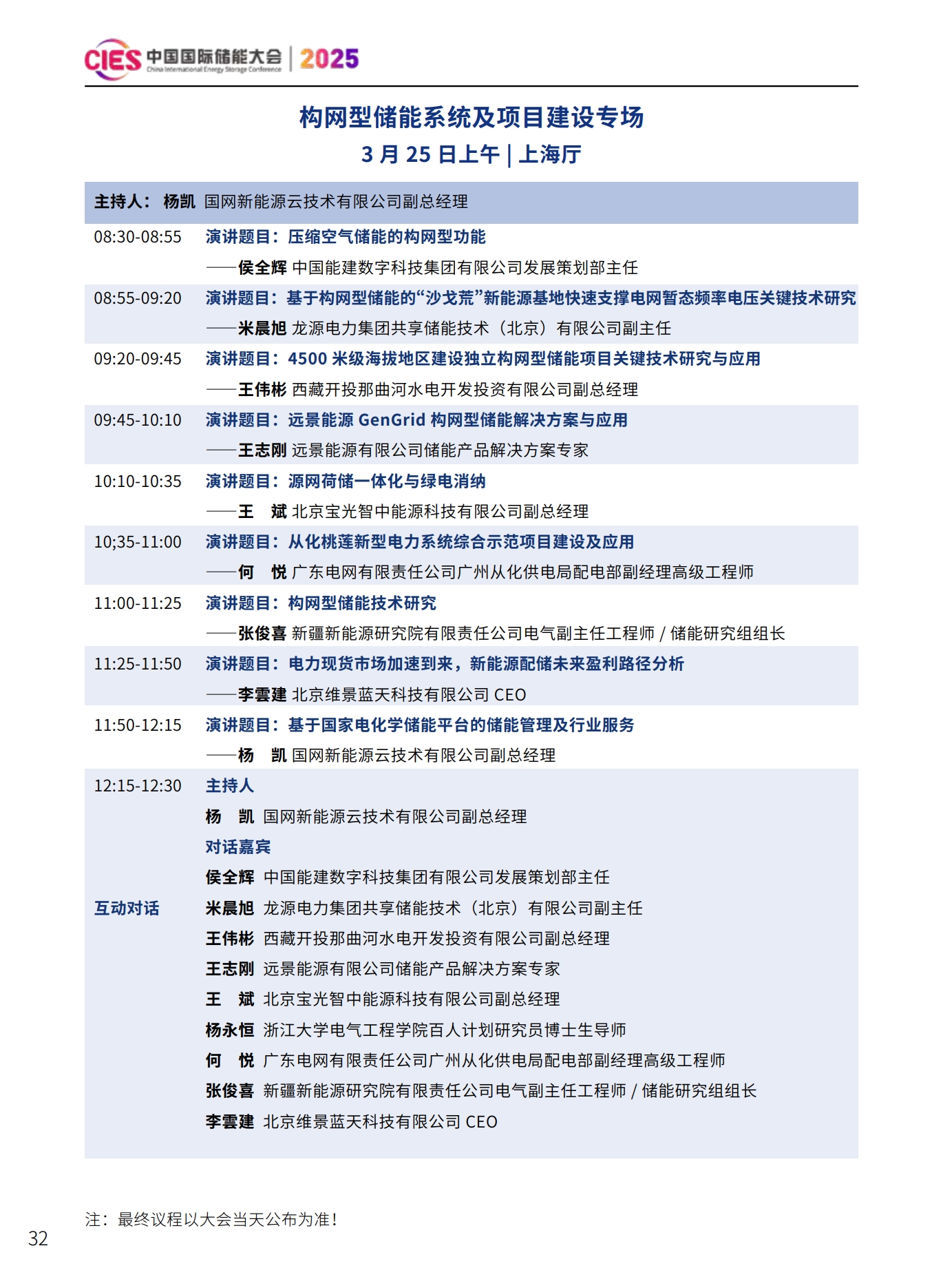 CIES2025儲能大會將設置:大會開幕式暨特邀院士專家報告、數(shù)智化配電網(wǎng)與新型儲能融合創(chuàng)新、新型電力系統(tǒng)與并網(wǎng)調(diào)度、新型儲能與新能源大基地協(xié)同發(fā)展、國際儲能、電力輔助服務、現(xiàn)貨交易及容量市場、工業(yè)綠色微電網(wǎng)、數(shù)智化新型儲能系統(tǒng)集成解決方案(上、下)、儲能消防、安全與檢測認證、新型儲能資本與投資、液流電池、儲熱與長時儲能技術、混合儲能、全球化新型儲能供應鏈機遇與挑戰(zhàn)、數(shù)智化工商業(yè)儲能解決方案與商業(yè)案例、虛擬電廠與車網(wǎng)互動、構網(wǎng)型儲能系統(tǒng)及項目建設、儲能專用電池ESG、新產(chǎn)品發(fā)布等22個專場。