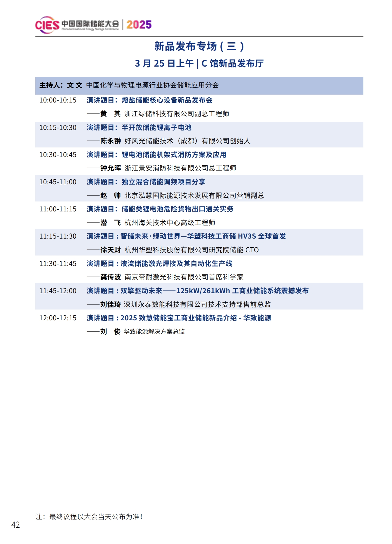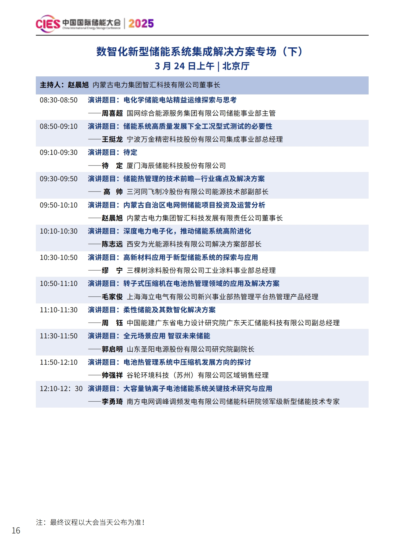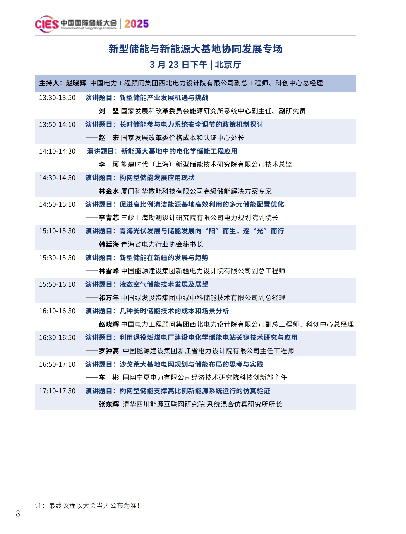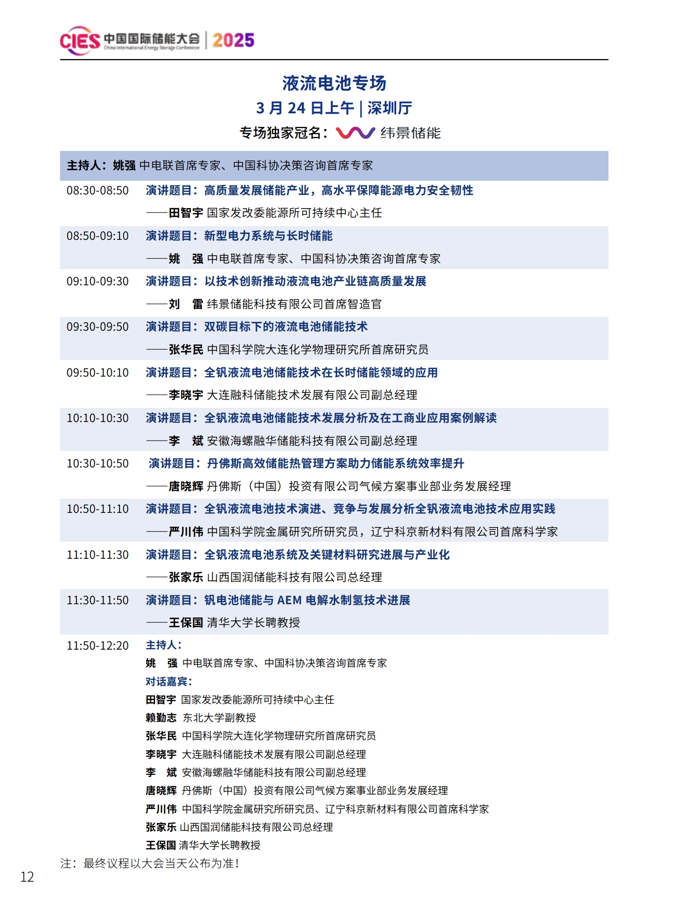 CIES2025儲能大會將設置:大會開幕式暨特邀院士專家報告、數(shù)智化配電網(wǎng)與新型儲能融合創(chuàng)新、新型電力系統(tǒng)與并網(wǎng)調(diào)度、新型儲能與新能源大基地協(xié)同發(fā)展、國際儲能、電力輔助服務、現(xiàn)貨交易及容量市場、工業(yè)綠色微電網(wǎng)、數(shù)智化新型儲能系統(tǒng)集成解決方案(上、下)、儲能消防、安全與檢測認證、新型儲能資本與投資、液流電池、儲熱與長時儲能技術、混合儲能、全球化新型儲能供應鏈機遇與挑戰(zhàn)、數(shù)智化工商業(yè)儲能解決方案與商業(yè)案例、虛擬電廠與車網(wǎng)互動、構網(wǎng)型儲能系統(tǒng)及項目建設、儲能專用電池ESG、新產(chǎn)品發(fā)布等22個專場。