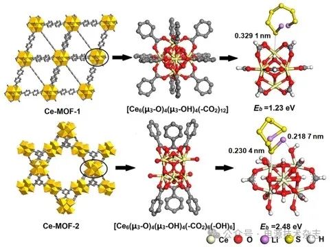 圖3 Ce-MOF-1和Ce-MOF-2的結(jié)構(gòu)、金屬節(jié)點(diǎn)和Li2S6吸附位點(diǎn)[18]