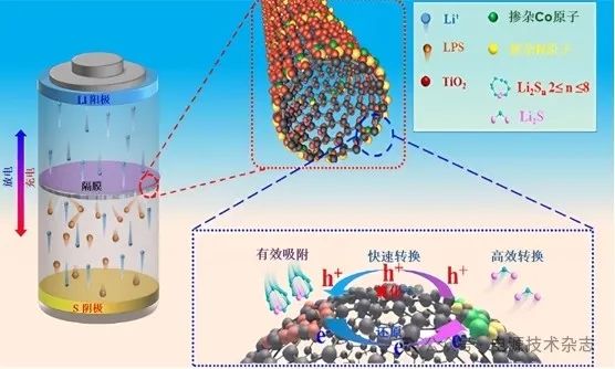 極性金屬化合物對(duì)LiPSs表現(xiàn)出優(yōu)異的電催化性能和較強(qiáng)的化學(xué)吸附能力。Xie等[19]采用化學(xué)氣相沉積法合成鈷基MOF復(fù)合氮摻雜碳納米管CNT/N-Co三維納米復(fù)合材料后,在表面負(fù)載TiO2納米顆粒以制備CNT/N-Co@TiO2復(fù)合隔膜(圖5)。極性組分TiO2對(duì)LiPSs的吸附、催化作用能有效抑制穿梭效應(yīng),防止因LiPSs在正極側(cè)的堆積,影響Li+傳輸。盡管金屬化合物有較強(qiáng)的LiPSs吸附力,但離子電導(dǎo)率、催化效果、孔隙率和比表面積不及MOFs衍生的金屬化合物。
