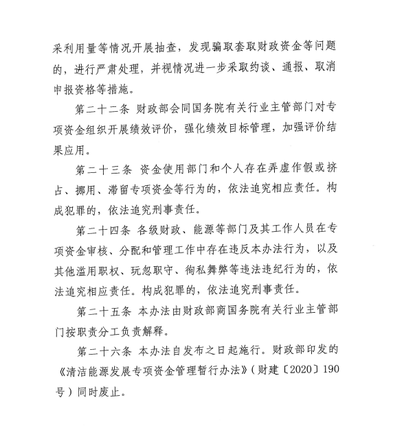 中國儲能網(wǎng)訊:3月12日,財政部印發(fā)《清潔能源發(fā)展專項資金管理辦法》(財建〔2025〕35號),要求規(guī)范和加強清潔能源發(fā)展專項資金管理,提高資金使用效益。《辦法》自發(fā)布之日起施行,此前財政部印發(fā)的《清潔能源發(fā)展專項資金管理暫行辦法》(財建〔2020〕190號)同時廢止。