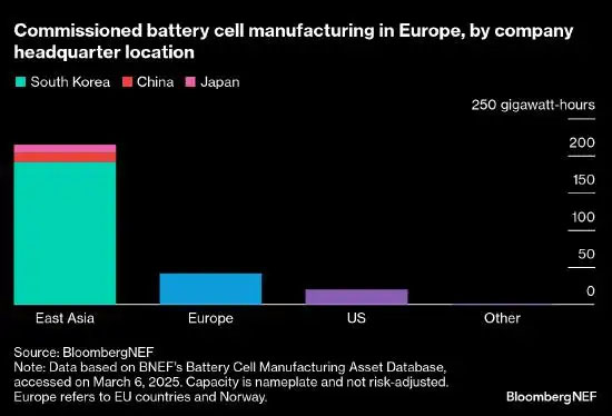 (注: 數(shù)據(jù)基于2025年3月6日獲取的彭博新能源財(cái)經(jīng)電池制造資產(chǎn)數(shù)據(jù)庫(kù)。產(chǎn)能為銘牌數(shù)據(jù),未經(jīng)風(fēng)險(xiǎn)調(diào)整。歐洲指歐盟國(guó)家和挪威。)