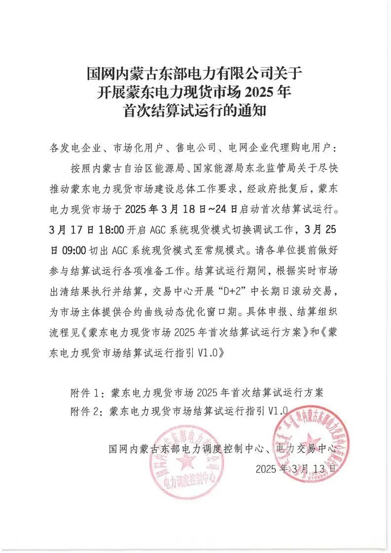 中國儲能網訊:近日,國網內蒙古東部電力有限公司發(fā)布《蒙東電力現貨市場2025年首次結算試運行工作方案》《蒙東電力現貨市場結算試運行指引V1.0》。