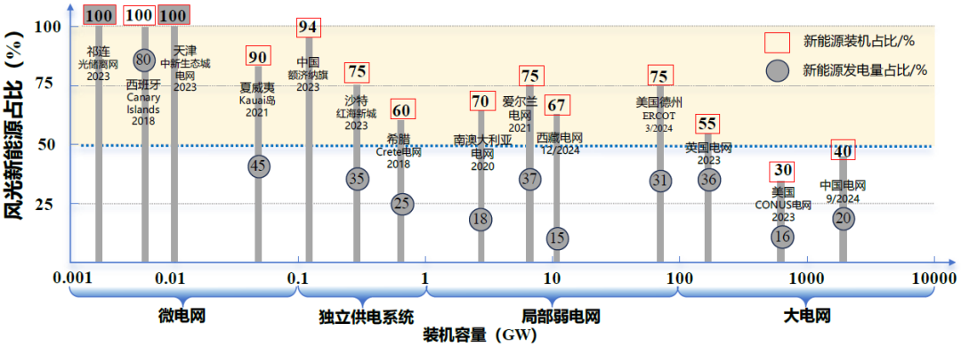 圖2 不同電網(wǎng)形態(tài)下的構(gòu)網(wǎng)型技術(shù)應(yīng)用案例及其新能源占比