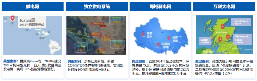 圖3 不同電網(wǎng)形態(tài)下構(gòu)網(wǎng)型技術(shù)應(yīng)用的典型案例