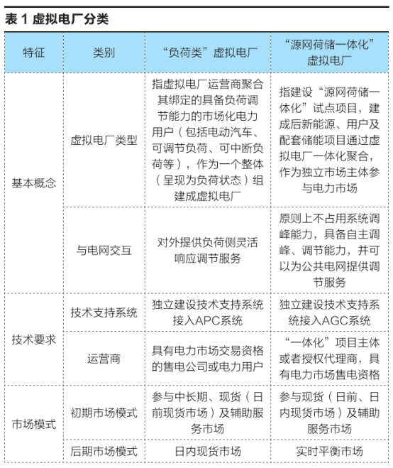 虛擬發(fā)電廠可以看作是一種先進的區(qū)域性電能集中管理模式,實現(xiàn)電源側的多能互補和負荷側的靈活互動。其核心在于“聚合”和“通信”。按照虛擬電廠聚合優(yōu)化的資源類別、可控精度、調(diào)節(jié)能力和接入系統(tǒng)不同,將虛擬電廠分為兩大類:“負荷類”虛擬電廠和“源網(wǎng)荷儲一體化”虛擬電廠。見表1。