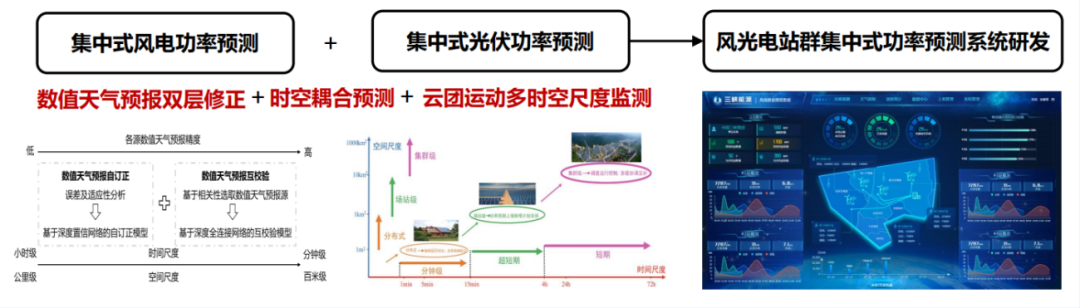 (1)“可測”為大規(guī)模區(qū)域風(fēng)光功率聯(lián)合預(yù)測技術(shù)。通過“數(shù)值天氣預(yù)報雙層修正+時空耦合預(yù)測+云團運動多時空尺度監(jiān)測”,大幅度提升多時間尺度預(yù)測能力和預(yù)測精度,解決了數(shù)值天氣預(yù)報時間空間分辨率不足、現(xiàn)有“一場一測”模式限制區(qū)域場群功率預(yù)測精度、局地氣象環(huán)境與云團生消形變影響下的光伏發(fā)電功率短時快速劇烈波動等問題。