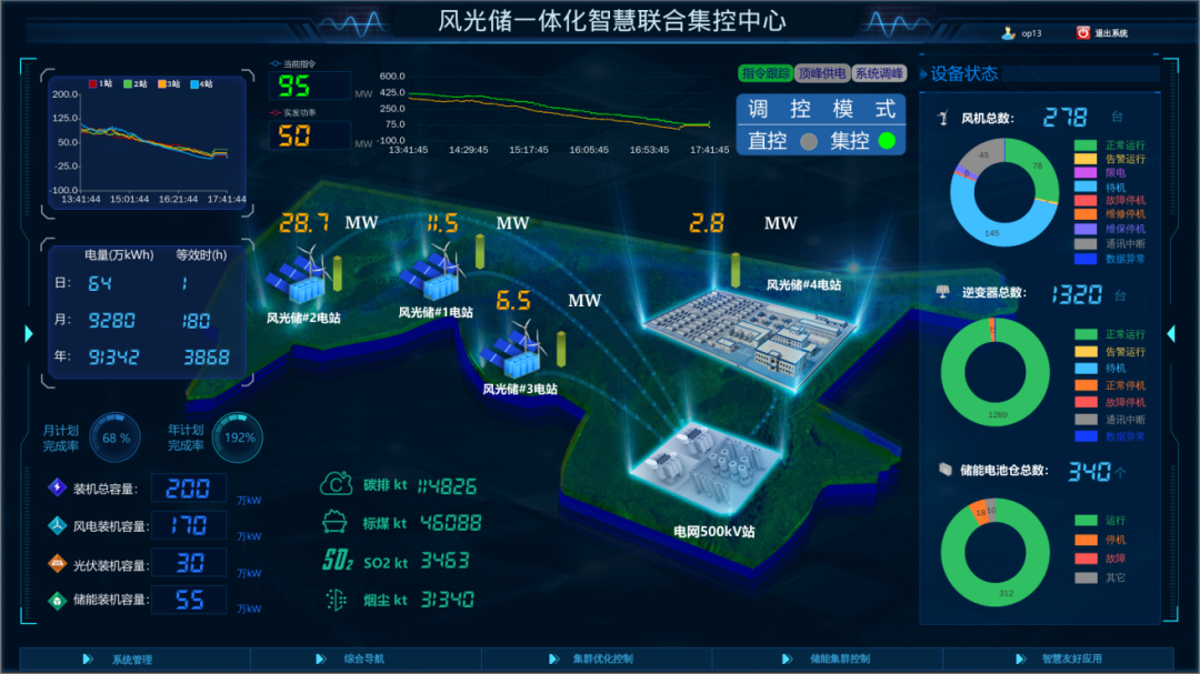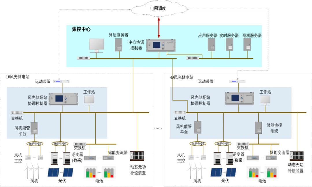 創(chuàng)新點1:在一體化智慧集控方面,本項目創(chuàng)新研發(fā)了風(fēng)光儲一體化智慧聯(lián)合集控系統(tǒng),在內(nèi)蒙古自治區(qū)能源局、內(nèi)蒙古電力集團的支持下,該項目未采用電網(wǎng)調(diào)度主站直接控制的方式,由電網(wǎng)下達總指令至風(fēng)光儲一體化集控平臺,然后由平臺進行分配,保障本項目可在毫秒級范圍內(nèi)達到一體化協(xié)調(diào)控制。