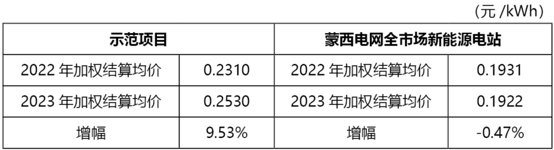 表1 示范項目與蒙西電網(wǎng)市場新能源電站2023年結(jié)算電價對比