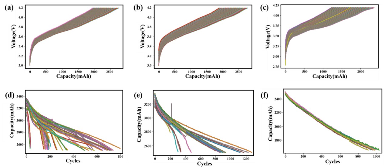 圖1 充電曲線衰減趨勢和電池容量衰減情況。(a, d)數(shù)據(jù)集1,(b, e)數(shù)據(jù)集2,(c, f)數(shù)據(jù)集3