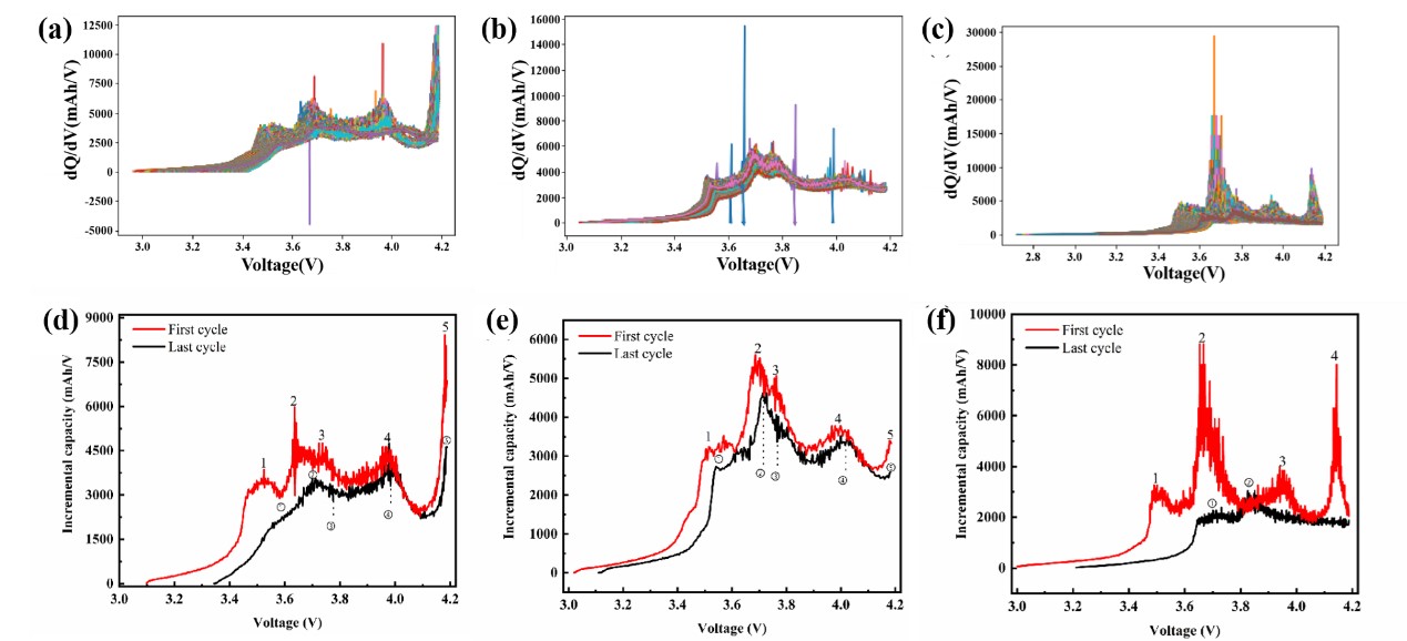 數(shù)據(jù)集3的電池采用NCM+NCA混合正極和石墨負(fù)極,其中一個電池的首末圈IC曲線變化趨勢如圖2f所示。IC曲線的每個峰均顯著右移,表明各相變過程對應(yīng)的平臺電壓顯著升高,反映了電池內(nèi)阻的大幅增加。四個特征峰均隨循環(huán)顯著衰減。特征峰1(3.50 V)、峰2(3.68 V)和峰3(3.96 V)分別對應(yīng)石墨負(fù)極的脫鋰反應(yīng)、NCM/NCA正極的嵌鋰反應(yīng)以及三元材料的副反應(yīng)。特征峰4由于內(nèi)阻較高,因此相應(yīng)的相變過程轉(zhuǎn)移至恒壓充電階段,導(dǎo)致該峰從IC曲線中消失。綜上所述,電池內(nèi)阻的顯著增加、正負(fù)極活性材料的損失以及副反應(yīng)和SEI膜生長導(dǎo)致的活性鋰離子損失共同導(dǎo)致了電池的容量衰減。