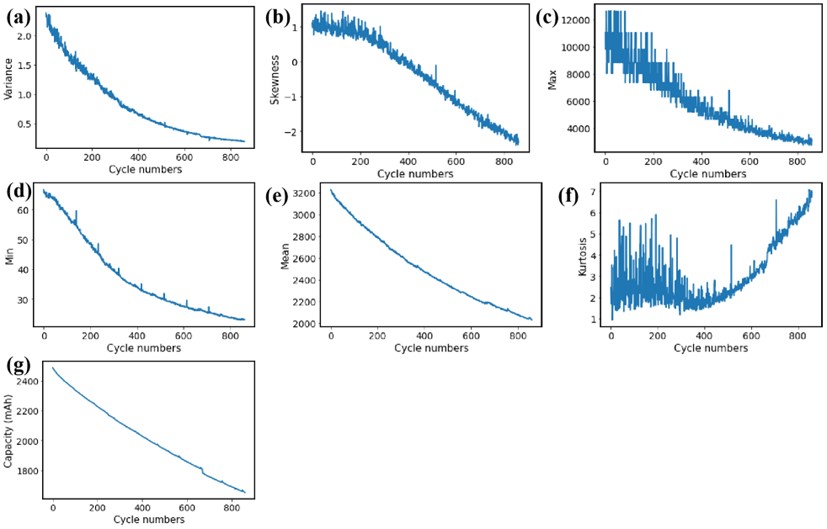 圖3 特征與容量衰減情況。(a)方差,(b)偏度,(c)最大值,(d)最小值,(e)平均值,(f)峰度,(g)容量。