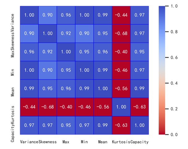 從圖3可以看出,上述六項(xiàng)特征值與容量衰減高度相關(guān),且均呈現(xiàn)出從大到小的變化趨勢。使用皮爾斯相關(guān)系數(shù)分析特征值與容量的相關(guān)性,相關(guān)性熱力圖由圖4所示。從圖4可知峰度與容量的皮爾森相關(guān)系數(shù)較低,絕對值為0.63,且在大約400次循環(huán)后呈現(xiàn)出相對明顯的上升趨勢,表明數(shù)據(jù)中的極值增加,這意味著電池循環(huán)壽命的中后期出現(xiàn)了更多的極端情況。其他五項(xiàng)特征值與容量的Pearson相關(guān)系數(shù)分別為0.97、0.97、0.95、0.97和0.99,證明了所提取的特征與容量衰減情況關(guān)聯(lián)度極高。