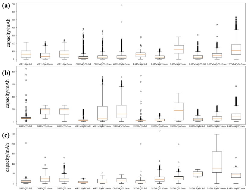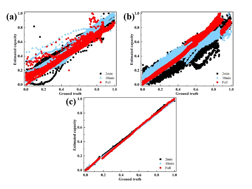 同樣,隨著數(shù)據(jù)覆蓋時間段的增加,估計(jì)精度持續(xù)提高。前2分鐘、前10分鐘和完整充電段的MAPE最大值分別為2.5%、1.3%和0.88%。在本研究中,更多的數(shù)據(jù)覆蓋了正負(fù)極活性材料更多的相變過程。這可以為模型學(xué)習(xí)提供不同電壓下材料相變和衰減的更多信息,從而實(shí)現(xiàn)更高的估計(jì)精度。