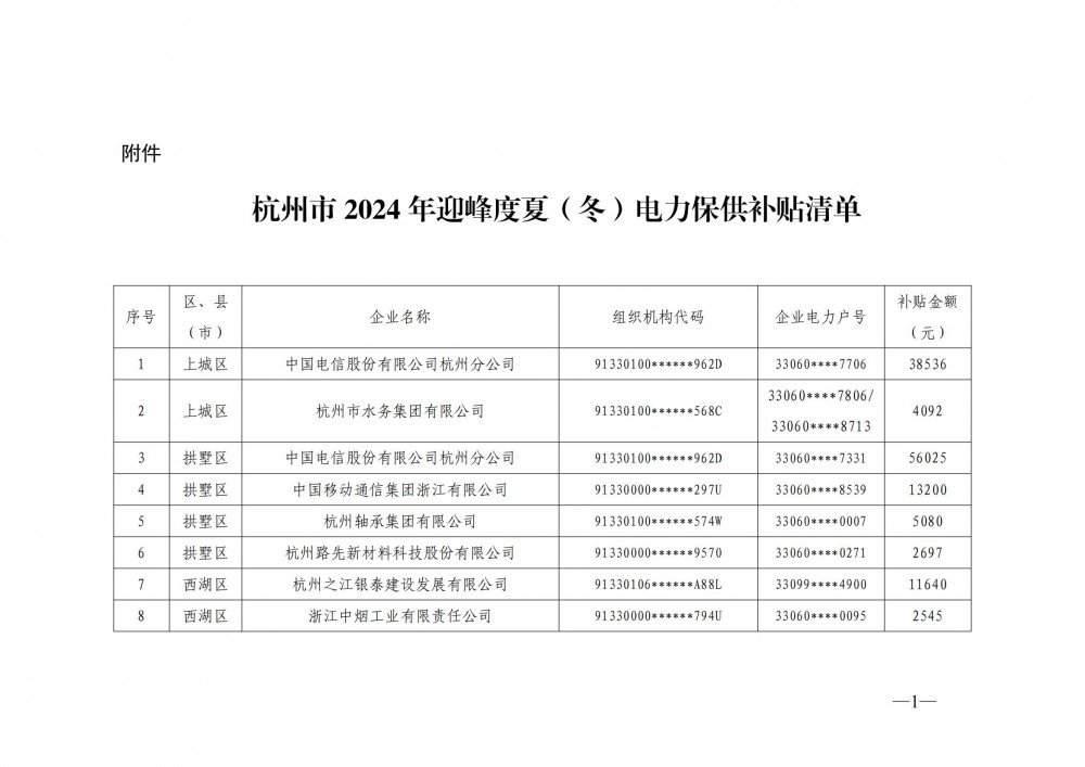 杭州市發(fā)改委關于2024年電力保供補貼清單的公示