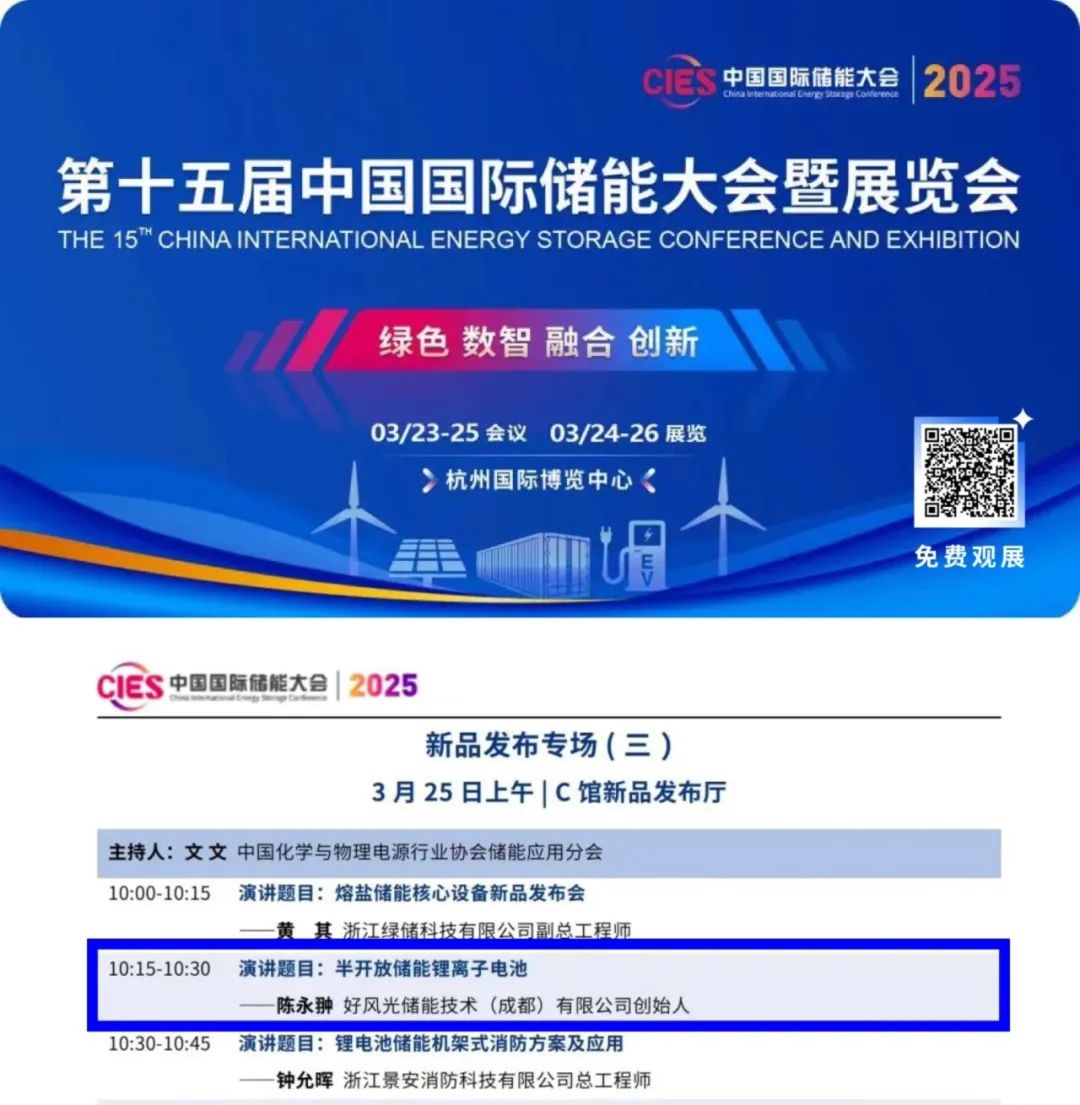 中國(guó)儲(chǔ)能網(wǎng)訊:第十五屆中國(guó)國(guó)際儲(chǔ)能大會(huì)暨展覽會(huì)于3月23日-3月26日在杭州召開(kāi),好風(fēng)光儲(chǔ)能將在本屆中國(guó)國(guó)際儲(chǔ)能大會(huì)期間進(jìn)行新品發(fā)布,正式推出目前開(kāi)始進(jìn)入市場(chǎng)的唯一本征安全鋰離子電池-半開(kāi)放儲(chǔ)能鋰離子電池。此次發(fā)布將重點(diǎn)展示公司在本征安全、延壽降本、綠色回收等方面的技術(shù)創(chuàng)新,并分享公司在長(zhǎng)時(shí)儲(chǔ)能領(lǐng)域的最新進(jìn)展。