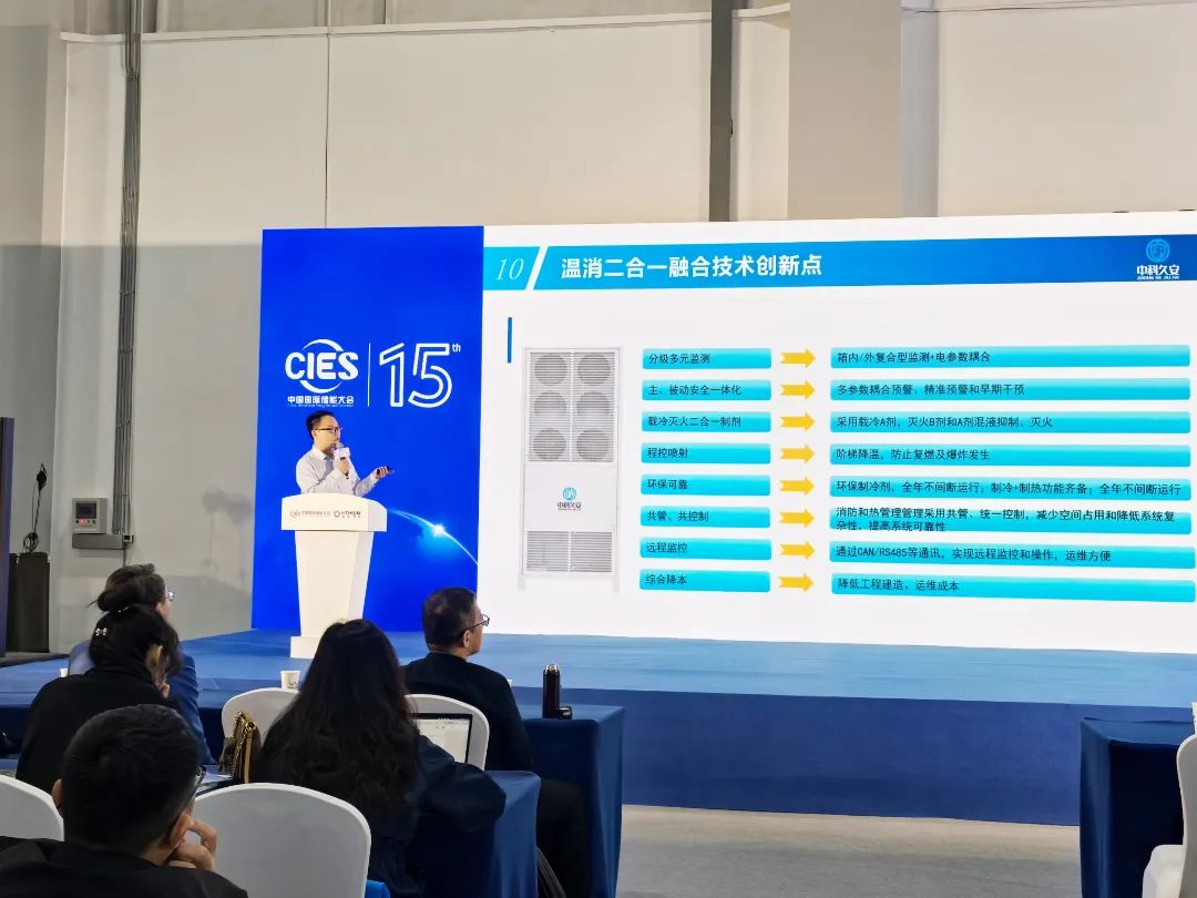 隨著儲能系統(tǒng)規(guī)?;瘧?yīng)用,安全與能效管理成為核心挑戰(zhàn)。3月24日下午,大會“新品發(fā)布專場”迎來了中科久安的技術(shù)高光時刻。項(xiàng)目技術(shù)部部長林啟明發(fā)表《全周期管理的儲能溫消一體化融合技術(shù)》的主題演講,中科久安首次公開傳播儲能溫控與消防深度協(xié)同的創(chuàng)新方案,直擊行業(yè)痛點(diǎn)。