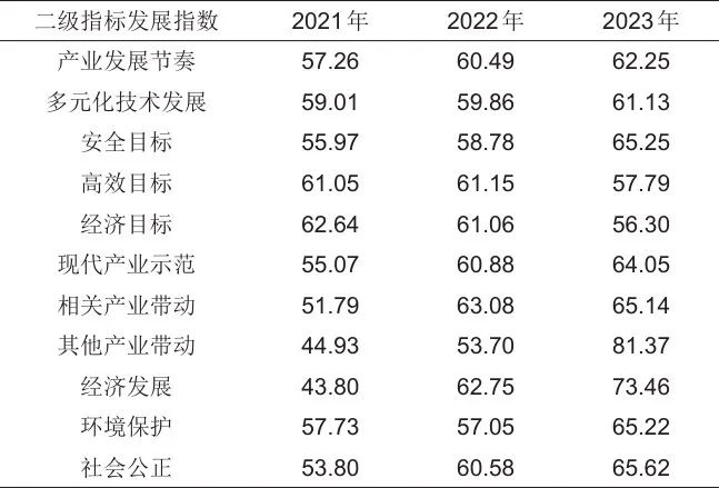 最終計(jì)算得出2021—2023年儲(chǔ)能產(chǎn)業(yè)高質(zhì)量發(fā)展綜合指數(shù)、各一級(jí)指標(biāo)發(fā)展指數(shù)、各二級(jí)指標(biāo)發(fā)展指數(shù)如表4~表6所示。