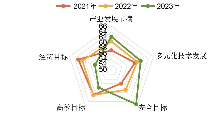 (2)對(duì)綜合指標(biāo)體系中二級(jí)指標(biāo)更深入地分析表明各個(gè)維度的發(fā)展也存在著不同的問(wèn)題。在“服務(wù)電力系統(tǒng)轉(zhuǎn)型升級(jí)”維度,高效目標(biāo)和經(jīng)濟(jì)目標(biāo)得分持續(xù)走低,安全目標(biāo)得分雖大幅提升,但儲(chǔ)能電站安全性仍堪憂,非計(jì)劃停運(yùn)次數(shù)由2021年的22.64次/100 MWh提升至2023年的26.73次/100 MWh。在“推動(dòng)現(xiàn)代化產(chǎn)業(yè)體系建設(shè)”維度,產(chǎn)能利用率連年降低至不足50%,鈷、鎳資源的對(duì)外依存度居高不下,均保持在90%以上。在“促進(jìn)經(jīng)濟(jì)社會(huì)可持續(xù)發(fā)展”維度,儲(chǔ)能相關(guān)企業(yè)2021—2023年的平均全要素生產(chǎn)率分別為3.43、3.72、3.38,呈波動(dòng)下降趨勢(shì),儲(chǔ)能產(chǎn)業(yè)整體碳排放隨生產(chǎn)規(guī)模的迅速擴(kuò)大也呈翻倍式增長(zhǎng)。