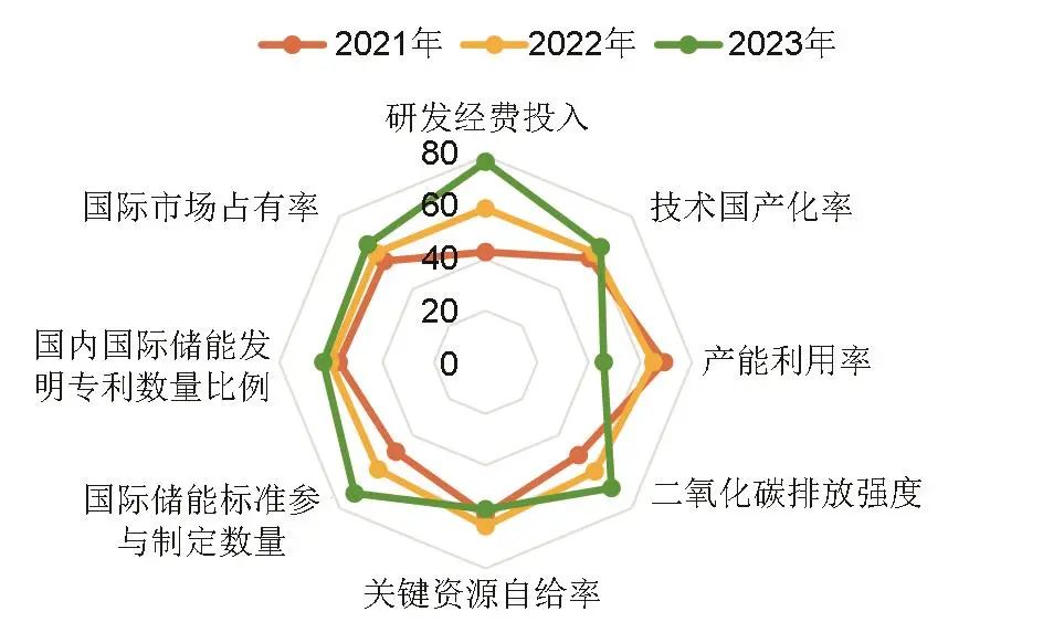 (2)“推動(dòng)現(xiàn)代化產(chǎn)業(yè)體系建設(shè)”維度的二級(jí)指標(biāo)發(fā)展指數(shù)均實(shí)現(xiàn)了不同程度的提升,如圖3所示。“其他產(chǎn)業(yè)帶動(dòng)”方面的表現(xiàn)最為亮眼,原因在于儲(chǔ)能的滲透率呈飛躍式增長(zhǎng),工商業(yè)儲(chǔ)能總裝機(jī)規(guī)模從2021年的730 MWh升至2023年的1797 MWh,增長(zhǎng)率接近146%。鑒于“現(xiàn)代產(chǎn)業(yè)示范”所涵蓋的三級(jí)指標(biāo)數(shù)量眾多,本文針對(duì)性地進(jìn)行了細(xì)致剖析,相應(yīng)三級(jí)指標(biāo)變化情況如圖4所示。由圖4可知,儲(chǔ)能產(chǎn)業(yè)在科技自立自強(qiáng)和國(guó)際產(chǎn)業(yè)高地建設(shè)方面取得良好成效,所有相關(guān)指標(biāo)持續(xù)向好,但是在產(chǎn)業(yè)鏈供應(yīng)鏈方面,盡管綠色供應(yīng)鏈的發(fā)展呈現(xiàn)出積極態(tài)勢(shì),但產(chǎn)業(yè)鏈供應(yīng)鏈的韌性和安全性并未同步增強(qiáng)。產(chǎn)能利用率連年下跌至不足50%,折射出產(chǎn)業(yè)內(nèi)部協(xié)作機(jī)制與有序發(fā)展尚處于較低的水準(zhǔn),此外,鋰鈷鎳關(guān)鍵原材料的高度進(jìn)口依賴問(wèn)題依然嚴(yán)峻,除鋰資源對(duì)外依存度在近年有10%左右的下降外,鈷、鎳資源的對(duì)外依存度在2023年已經(jīng)分別達(dá)到了99%和95%。