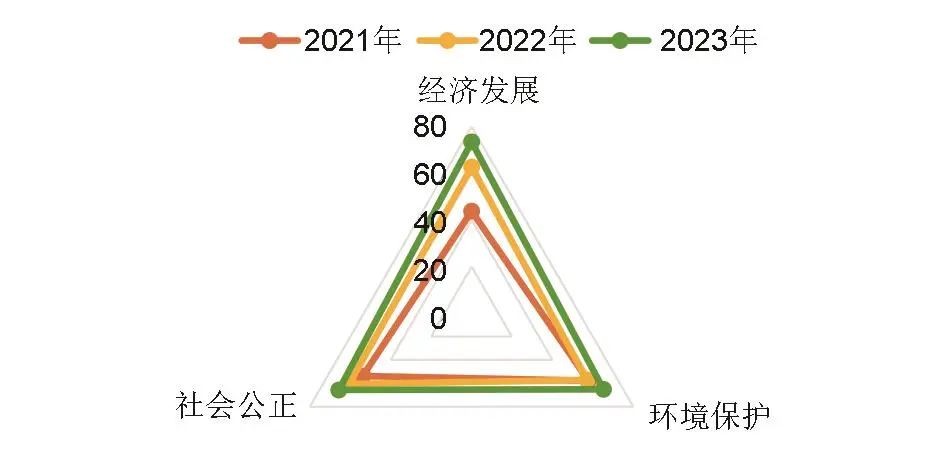 (3)“促進(jìn)經(jīng)濟(jì)社會(huì)可持續(xù)發(fā)展”維度的二級(jí)指標(biāo)發(fā)展指數(shù)也均有提升,如圖5所示。從經(jīng)濟(jì)發(fā)展視角看,儲(chǔ)能產(chǎn)業(yè)在支撐經(jīng)濟(jì)總量增長(zhǎng)方面的作用愈發(fā)顯著,但是在提升經(jīng)濟(jì)發(fā)展質(zhì)量方面還有所欠缺,根據(jù)OP法計(jì)算出的企業(yè)全要素生產(chǎn)率分別為3.43、3.72、3.38;從環(huán)境保護(hù)視角看,儲(chǔ)能的新能源消納量與資源循環(huán)利用量在近兩年都是呈倍數(shù)增長(zhǎng),為減輕環(huán)境負(fù)擔(dān)與推動(dòng)綠色轉(zhuǎn)型貢獻(xiàn)了巨大力量。不過(guò),伴隨著產(chǎn)業(yè)的快速發(fā)展,儲(chǔ)能產(chǎn)業(yè)的碳排放量亦呈現(xiàn)出快速增長(zhǎng)態(tài)勢(shì),儲(chǔ)能產(chǎn)業(yè)自身的碳排放增長(zhǎng)問(wèn)題成為一個(gè)不容忽視的問(wèn)題;從社會(huì)公正視角看,儲(chǔ)能在促進(jìn)高質(zhì)量充分就業(yè)和縮小地區(qū)發(fā)展差距方面都展現(xiàn)出積極影響。儲(chǔ)能產(chǎn)業(yè)吸納的就業(yè)人數(shù)達(dá)到數(shù)十萬(wàn)并且還在不斷增加,城鄉(xiāng)、不同區(qū)域都在積極利用和挖掘儲(chǔ)能供需兩側(cè)的要素價(jià)值并將其轉(zhuǎn)化為經(jīng)濟(jì)發(fā)展動(dòng)力。