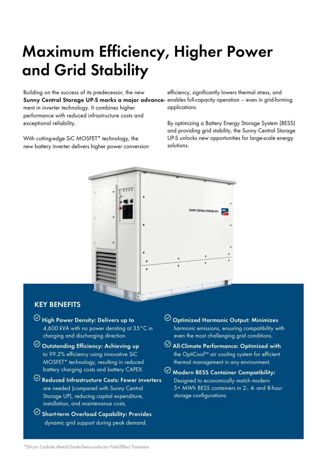 SiC MOSFET的應(yīng)用是此次Sunny Central Storage UP-S的核心優(yōu)勢(shì)所在。這一創(chuàng)新不僅能讓逆變器實(shí)現(xiàn)更高效的功率轉(zhuǎn)換,大幅降低熱負(fù)荷,并且在構(gòu)網(wǎng)過程中也能滿負(fù)荷運(yùn)行。這為開發(fā)商和運(yùn)營商帶來了更高的功率回報(bào)和更強(qiáng)的盈利能力,同時(shí)也降低了設(shè)施維護(hù)成本。