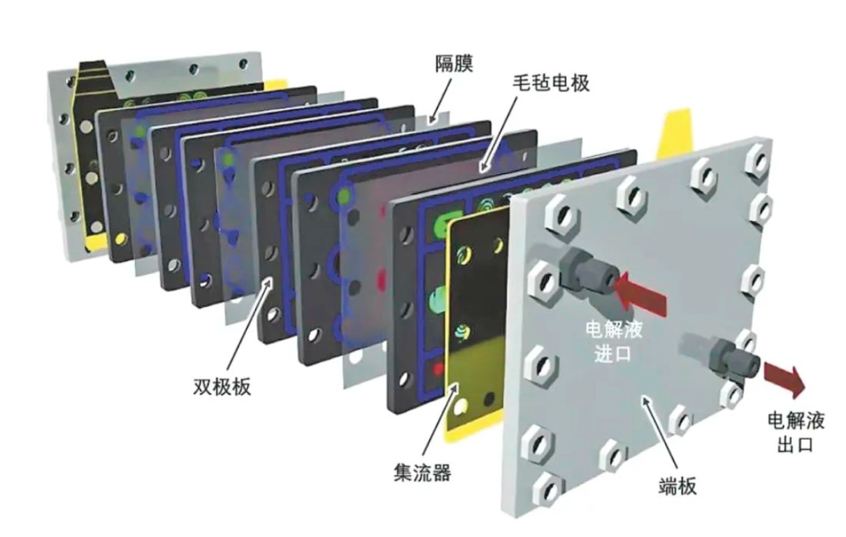 全釩液流電池結(jié)構(gòu)拆截圖。