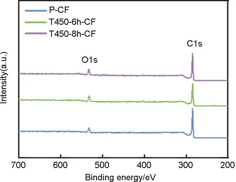 利用XPS測(cè)試對(duì)低溫處理的碳?xì)蛛姌O表面元素和官能團(tuán)組成進(jìn)行了分析。如圖7所示,P-CF、T450-6h-CF和T450-8h-CF的XPS全譜圖上都有兩個(gè)峰,即對(duì)應(yīng)O(約532 eV)和C(約285 eV)兩種元素。與P-CF相比,熱處理后碳?xì)諳1s峰值強(qiáng)度增大,可知熱處理使得碳?xì)直砻嫜趸肓舜罅亢豕倌軋F(tuán)。為進(jìn)一步分析含氧官能團(tuán)類型,對(duì)O1s進(jìn)行了分峰處理,如圖8(a)~(c)所示。其中,531.5 eV、532.5 eV和533.8 eV分別對(duì)應(yīng)于C=O、C—OH和COOH官能團(tuán)。圖8(d)給出了上述含氧官能團(tuán)在各樣品中的含量。可以看到,原始碳?xì)趾趿肯鄬?duì)較低,主要以C—OH和C=O為主。經(jīng)450 ℃熱處理活化后,碳?xì)值难鹾吭黾?,主要增加的是C=O和COOH官能團(tuán)。且隨著熱處理保溫時(shí)間的延長(zhǎng),含氧量進(jìn)一步提高,且以COOH官能團(tuán)增加為主。