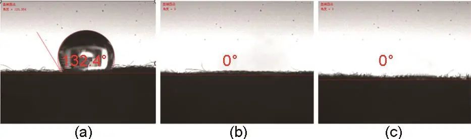 圖9 接觸角:(a) P-CF;(b) T450-6h-CF;(c) T450-8h-CF