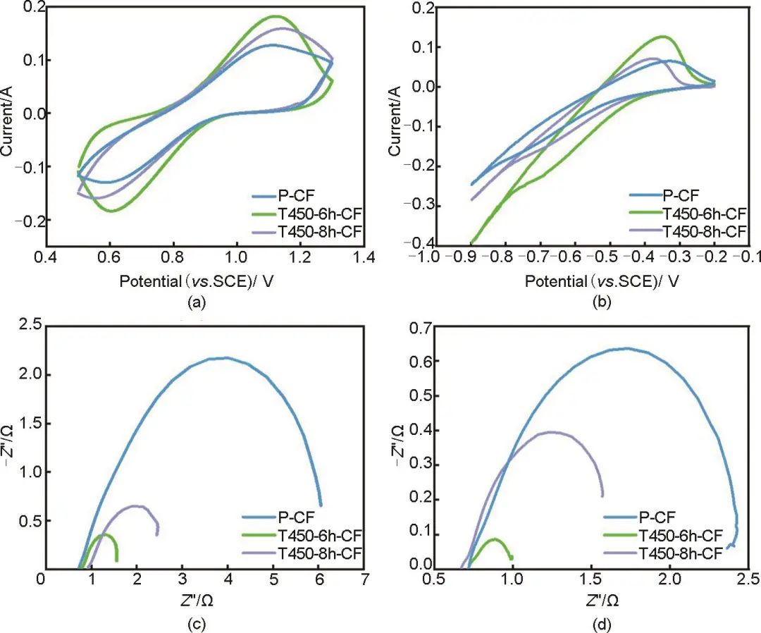 為進(jìn)一步考察活化電極的電化學(xué)性能,對(duì)P-CF、T450-6h-CF和T450-8h-CF進(jìn)行了循環(huán)伏安測(cè)試。圖10(a)為VO2+/VO2+反應(yīng)的CV曲線,相比其他樣品,T450-6h-CF表現(xiàn)出最大的氧化和還原峰電流,分別為0.182 A和0.183 A,且具有最小的峰位差(ΔE),以上現(xiàn)象表明T450-6h-CF電極對(duì)釩電池正極反應(yīng)具有良好的電化學(xué)反應(yīng)活性和可逆性。圖10(b)為V2+/V3+反應(yīng)的CV曲線,T450-6h-CF同樣表現(xiàn)出最大的氧化峰電流(0.126 A),說明活化后電極對(duì)負(fù)極反應(yīng)的活性也得到了一定程度改善。需要強(qiáng)調(diào)的是,并非熱處理時(shí)間越長(zhǎng)改性效果越好,這主要與活化后電極表面含氧官能團(tuán)的含量、類型有關(guān)。前期工作表明,COOH官能團(tuán)會(huì)抑制電極界面的電子轉(zhuǎn)移過程,因而并非含氧官能團(tuán)含量越高催化效果越佳。對(duì)該組樣品還進(jìn)行了電化學(xué)阻抗譜測(cè)試。圖10(c)和圖10(d)分別為VO2+/VO2+反應(yīng)和V2+/V3+反應(yīng)的Nyquist圖。由圖可見,所有樣品均呈現(xiàn)出一個(gè)阻抗弧,表明電極過程由電化學(xué)反應(yīng)步驟控制。通過定性比較高頻阻抗弧,發(fā)現(xiàn)T450-6h-CF對(duì)釩電池正負(fù)極反應(yīng)均表現(xiàn)出最小的電荷轉(zhuǎn)移電阻,這與CV測(cè)試結(jié)果一致。這是由于450 ℃處理6 h后碳?xì)直砻嬉肓诉m量的含氧官能團(tuán),提高了電極催化活性和親液性。