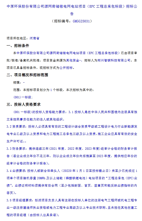 中國儲(chǔ)能網(wǎng)訊:3月27日,中原環(huán)保股份有限公司源網(wǎng)荷儲(chǔ)微電網(wǎng)電站項(xiàng)目(EPC工程總承包標(biāo)段)招標(biāo)公告發(fā)布,項(xiàng)目包括中原環(huán)保微電網(wǎng)儲(chǔ)能電站項(xiàng)目及鄭州智碳科技有限公司中原環(huán)保微電網(wǎng)儲(chǔ)能電站建設(shè)項(xiàng)目。其中鄭州新區(qū)污水處理廠,儲(chǔ)能總裝機(jī)容量為5MW/10MWh,10kV并網(wǎng),屬于用戶側(cè)儲(chǔ)能站。儲(chǔ)能電站采用戶外布置形式,儲(chǔ)能變流升壓一體倉、儲(chǔ)能電池倉及并網(wǎng)倉集中布置,儲(chǔ)能介質(zhì)選用磷酸鐵鋰電池。鄭州馬頭崗污水處理廠,儲(chǔ)能總裝機(jī)容量為7.5MMW/15MWh,10kv并網(wǎng),屬于用戶端儲(chǔ)能站,儲(chǔ)能電站采用戶外布置形式,儲(chǔ)能變流升壓一體倉、儲(chǔ)能電池倉及并網(wǎng)倉集中布置,儲(chǔ)能介質(zhì)選用磷酸鐵鋰電池。