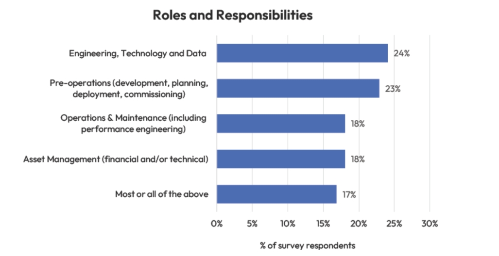18%受訪者從事資產(chǎn)管理工作(財務(wù)或技術(shù)),還有18%受訪者從事運(yùn)營和維護(hù)工作,24%受訪者從事工程、技術(shù)或數(shù)據(jù)工作,23%受訪者從事前運(yùn)營工作(開發(fā)、規(guī)劃、部署或調(diào)試)。有17%受訪者所擔(dān)任的角色涵蓋了這些職責(zé)的組合。