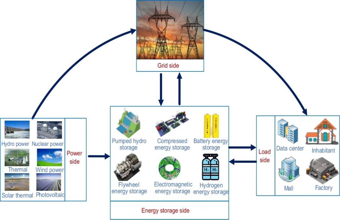 隨著雙碳目標的穩(wěn)步推進,風能、太陽能等可再生能源已成為電力新增裝機的主體。然而,可再生能源受自然條件的限制,具有間歇性、波動性等特點,致使現有電網難以消納大量可再生能源電力,造成棄風棄光現象。為提高可再生能源消納水平,保持電網“源隨荷動”的平衡,儲能技術得到了大規(guī)模發(fā)展,可在發(fā)電側、電網側和用戶側進行靈活的部署,如圖1所示。目前,儲能主要分為抽水蓄能、壓縮儲能、熱泵儲能、飛輪儲能、電化學儲能及電磁儲能等技術路線。就儲能規(guī)模、安全性及使用壽命而言,抽水蓄能和壓縮儲能更具優(yōu)勢。相比抽水蓄能,壓縮儲能布置更為靈活,依據儲能介質,可分為壓縮空氣儲能和壓縮CO2儲能。