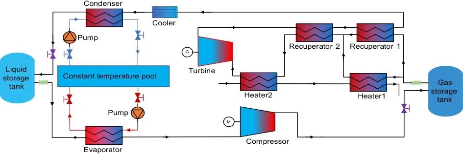 摘 要 作為一種新型的壓縮儲能技術,壓縮CO2儲能近年來受到學術界及企業(yè)界的廣泛關注,可滿足我國大規(guī)模長時儲能的需求,具有良好的發(fā)展前景。對此,本文從壓縮CO2儲能系統(tǒng)、CO2存儲裝置兩方面梳理了該技術的研究現狀。結果表明,現有壓縮CO2儲能系統(tǒng)主要分為5類,即低壓罐超臨界/高壓罐超臨界儲能、低壓罐液態(tài)/高壓罐超臨界儲能、低壓罐氣態(tài)/高壓罐超臨界儲能、低壓罐液態(tài)/高壓罐液態(tài)儲能、低壓罐氣態(tài)/高壓罐液態(tài)儲能。理論研究主要在于系統(tǒng)性能的穩(wěn)態(tài)分析,鮮有系統(tǒng)全工況的動態(tài)特性分析,而示范項目則多采用高壓液態(tài)-低壓常壓柔性存儲的儲能方案。對于CO2存儲裝置,主要有地下咸水層、地下鹽穴、柔性儲氣棚、吸附儲氣床、儲氣罐及儲液罐,其中柔性儲氣棚、儲氣/液罐已有工程應用,但儲氣棚體積巨大,而儲罐內CO2在充放電過程中的熱力特性仍需進一步研究。在此基礎上,本文介紹了壓縮CO2儲能系統(tǒng)未來發(fā)展的趨勢。一方面,壓縮CO2儲能涉及多種能源形式,可與外界冷熱源及其他熱力系統(tǒng)耦合,以滿足負荷側冷熱電儲的需求,提高系統(tǒng)整體能效水平。另一方面,可引入有機工質與CO2混合,解決低壓CO2液態(tài)存儲的易結干冰、系統(tǒng)壓比較低的問題,從而實現高低壓液態(tài)存儲,以極大提高壓縮儲能密度。