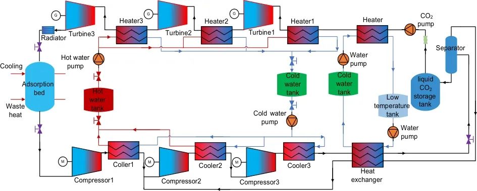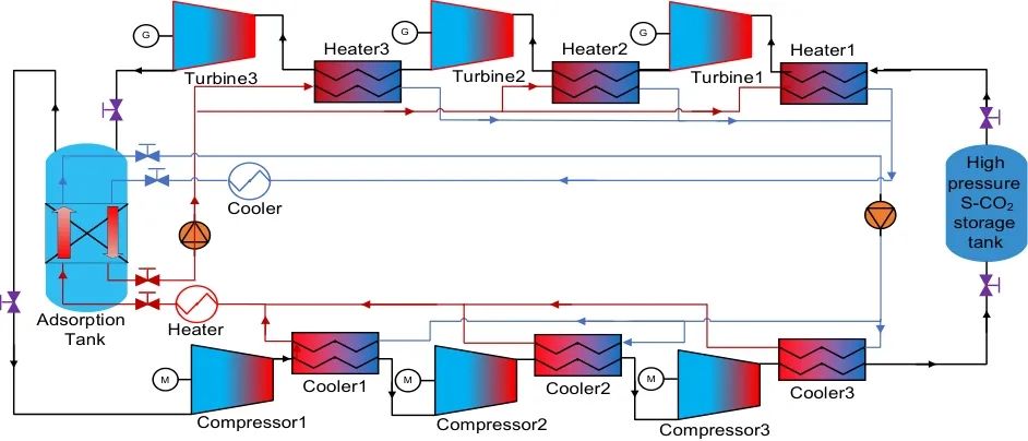 圖7 三級壓縮-三級膨脹的吸附式V-CO2/S-CO2儲能系統(tǒng)