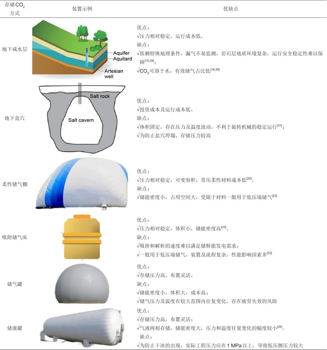 在壓縮CO2儲能系統(tǒng)中,高低壓CO2的存儲是實現CO2壓縮儲電與膨脹發(fā)電錯時運行的關鍵,直接決定著儲能效率及儲能密度。依據CO2存儲相態(tài)及方式,相關裝置主要分為地下咸水層、地下鹽穴、柔性儲氣棚、吸附儲氣床、儲氣罐及儲液罐,如表2所列。