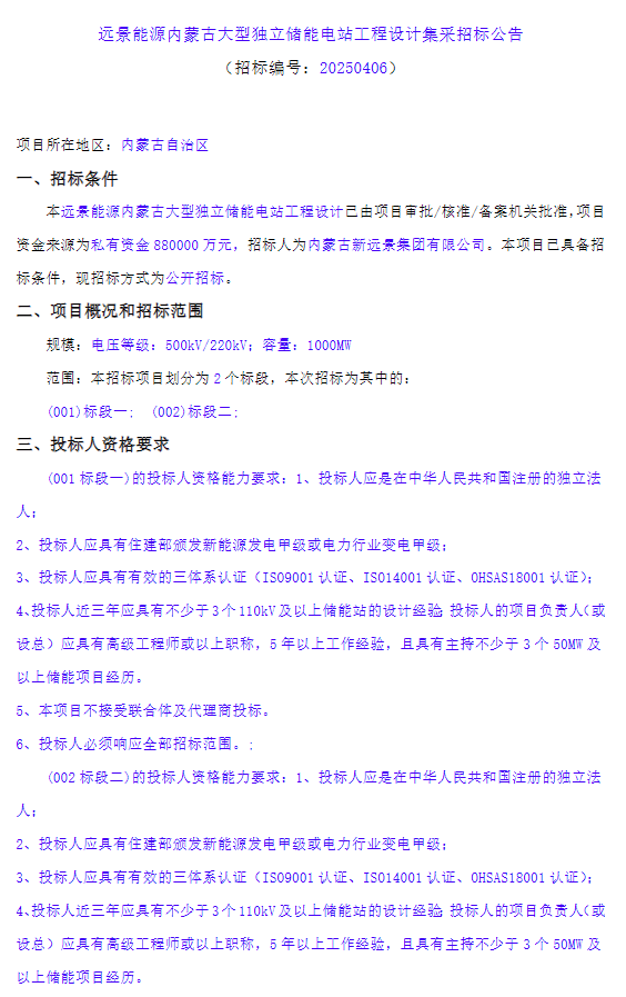 中國(guó)儲(chǔ)能網(wǎng)訊:4月7日,遠(yuǎn)景能源發(fā)布內(nèi)蒙古大型獨(dú)立儲(chǔ)能電站工程設(shè)計(jì)集采招標(biāo)公告。項(xiàng)目資金來(lái)源為私有資金880000萬(wàn)元,折合總投資單價(jià)1.1元/Wh,招標(biāo)人為內(nèi)蒙古新遠(yuǎn)景集團(tuán)有限公司。